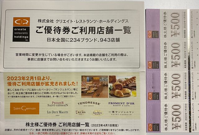 2月権利 クリエイトレストランツHDより、優待券が届きました。