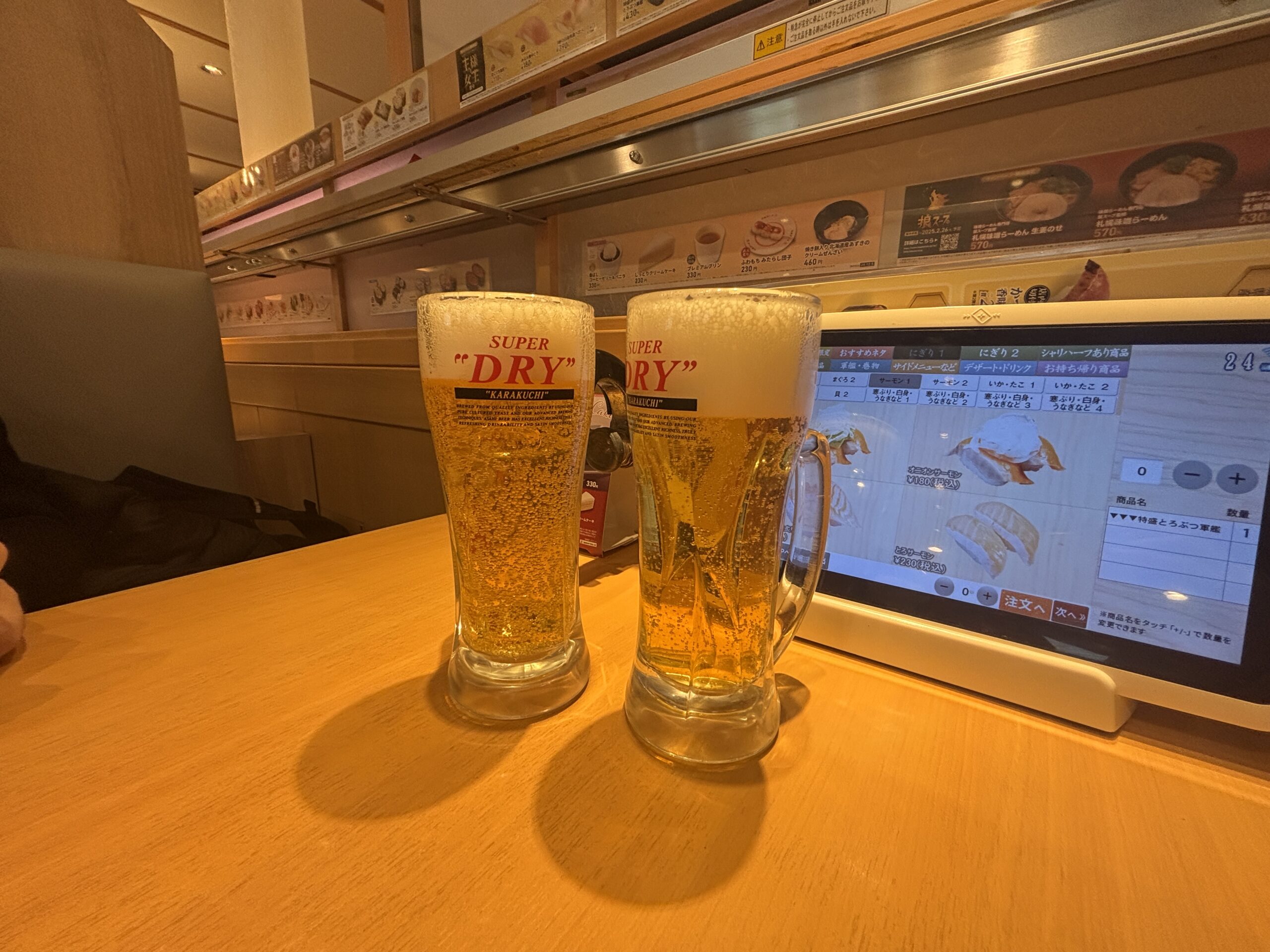 お酒は、ビール2杯ずつと熱燗1合、お寿司は他にも数皿頼んで、