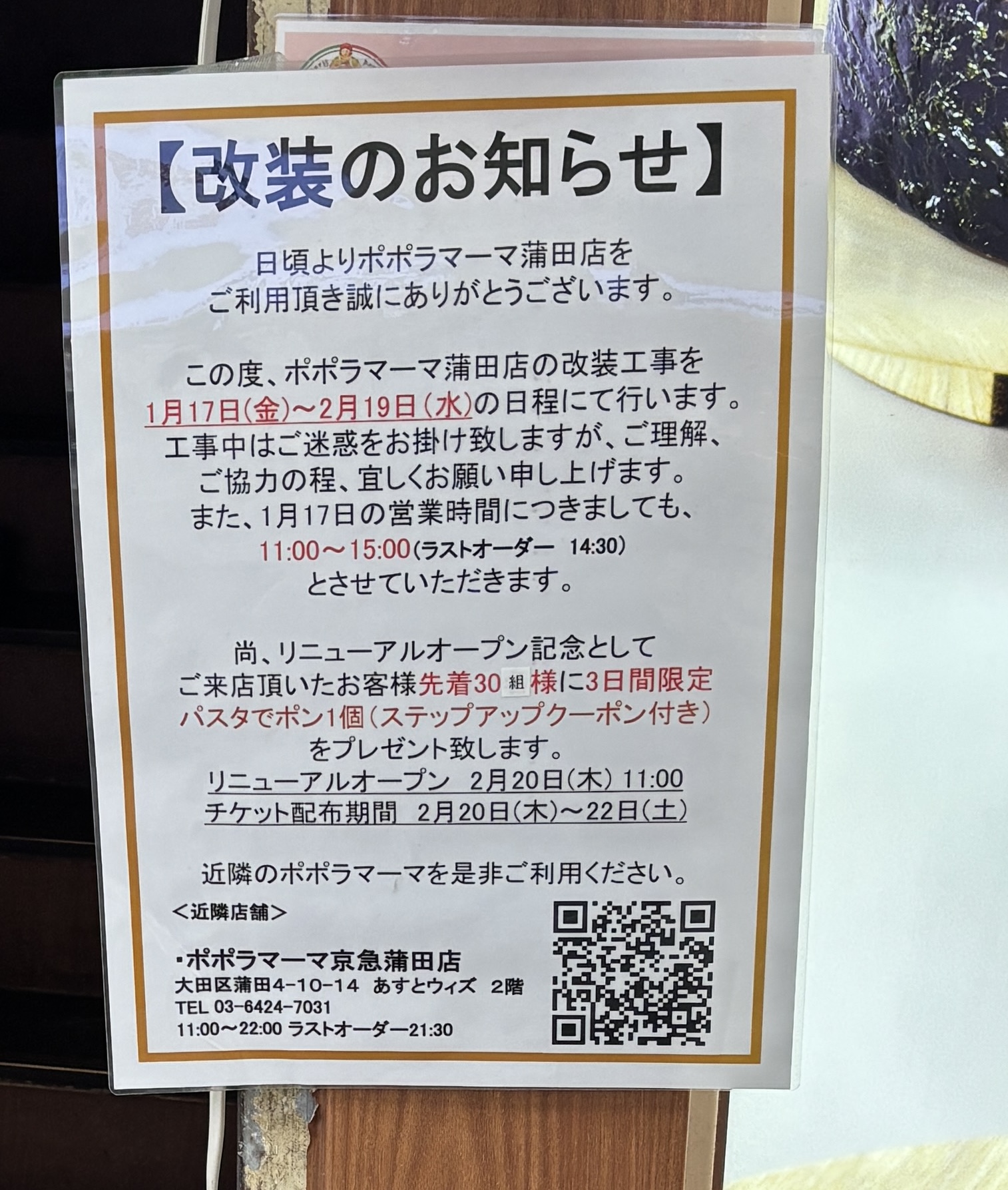 なお、ランチ第一候補のポポラマーマは、改装工事中でした。