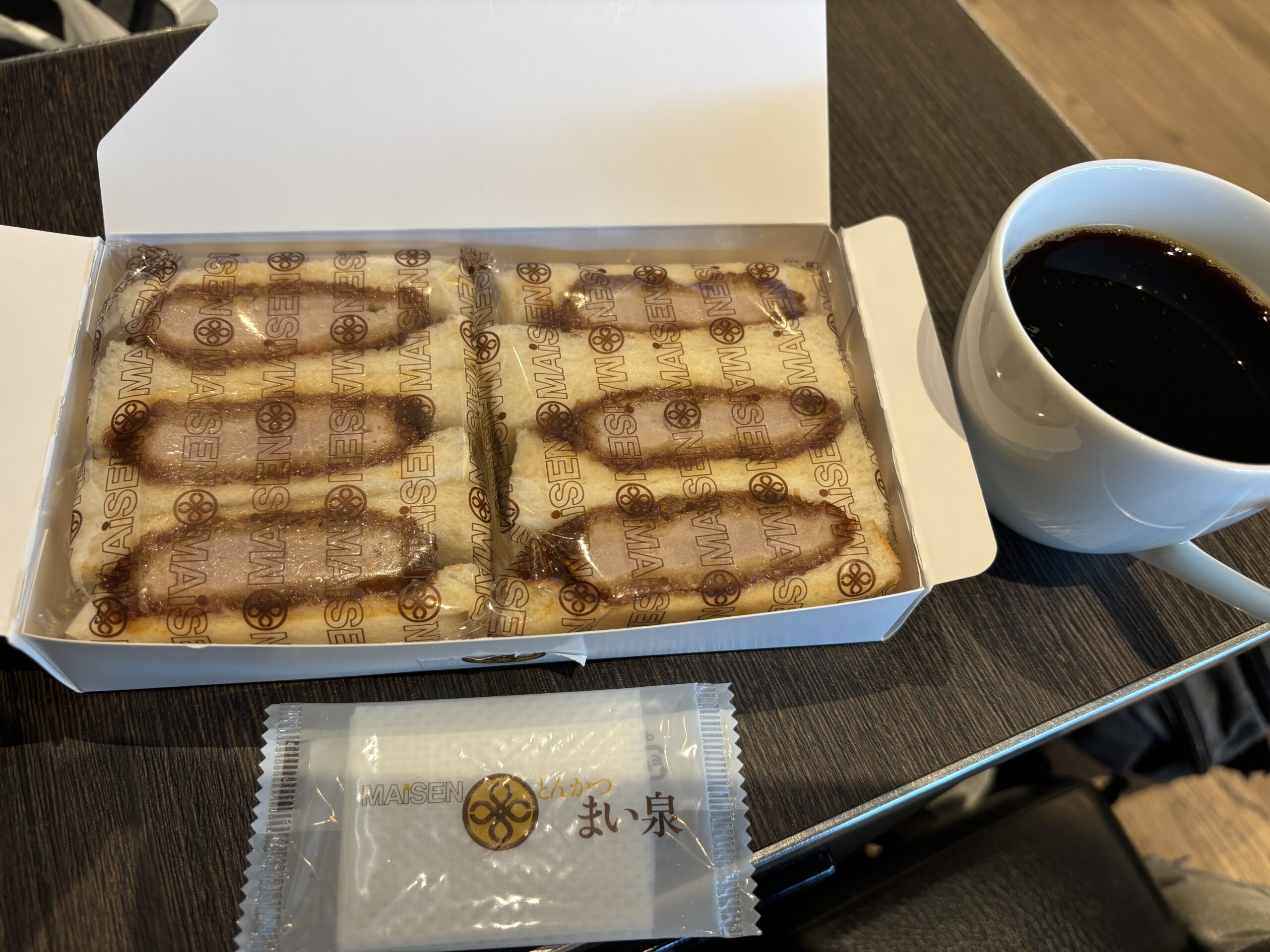鹿児島では、レンタカーで移動予定で、アルコールは封印。ホットコーヒーをいただきました。まい泉のカツサンドはANAフェスタでANAのカード払いで5%オフでお得です♪