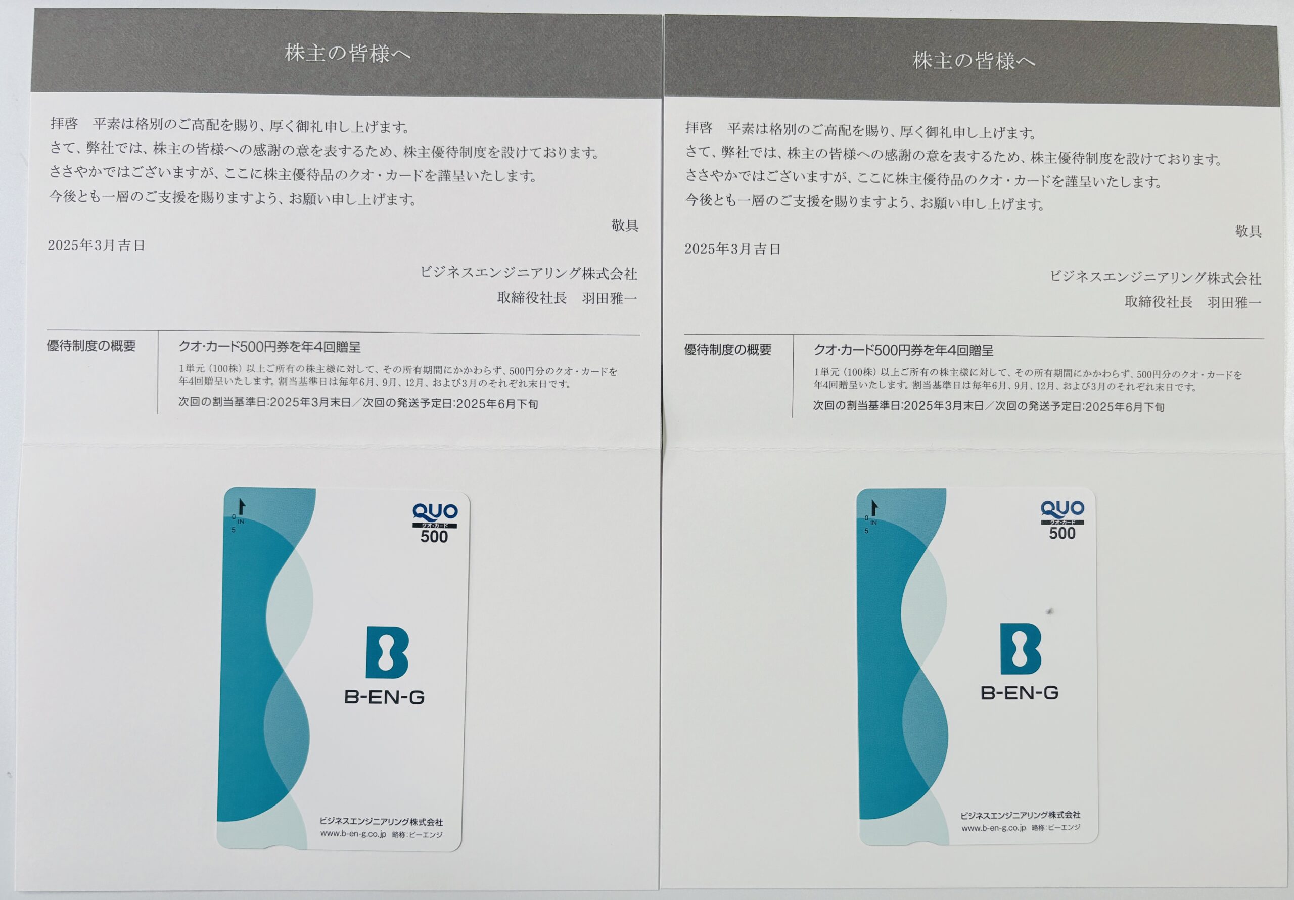 12月権利分のビジネスエンジニアリング(4828)の優待クオカードが到着しました。