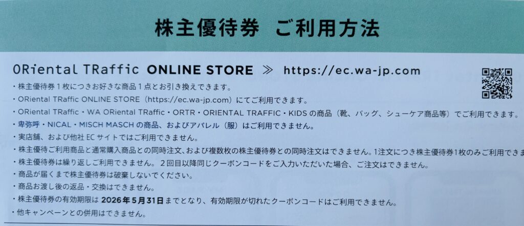 100株 「ORiental TRaffic ONLINE STORE」のサイトで靴やバッグ等1足無料券(上限なし)