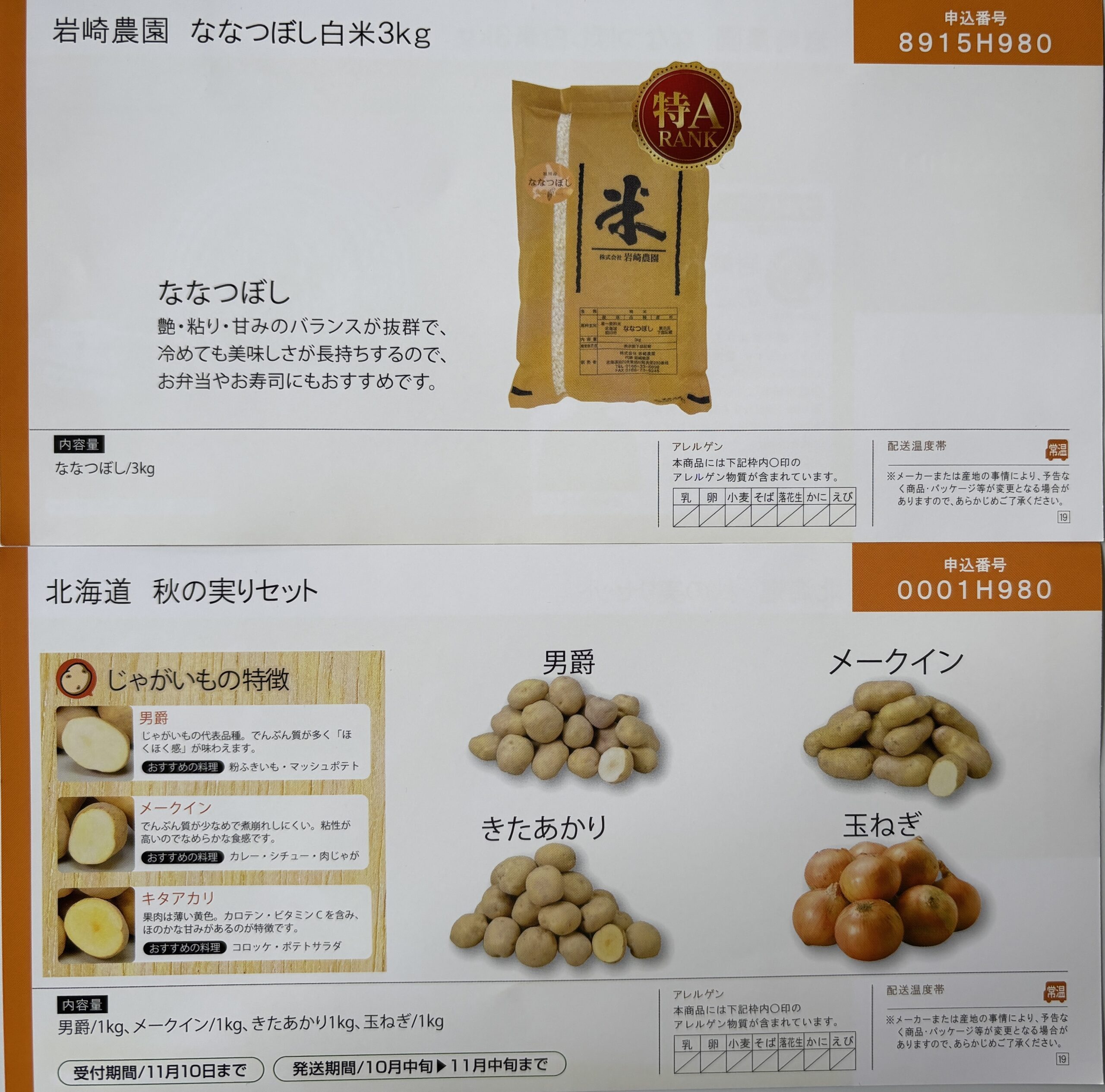 2名義分もらいまして、1名義分は「北海道 秋の実りセット(じゃがいも・たまねぎ)」を受け取り済みです。