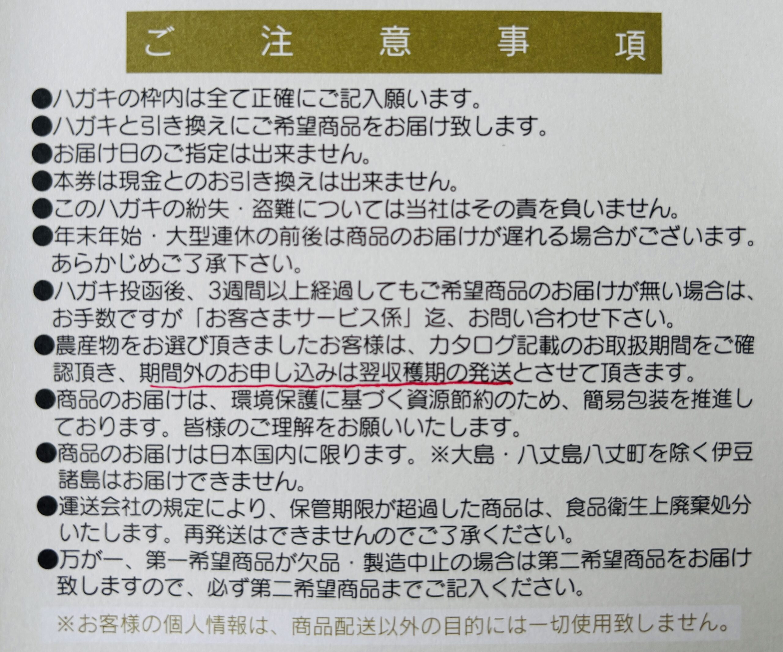 赤線を引いてみましたが、「期間外のお申込みは翌収穫期の発送」と書いてあります。