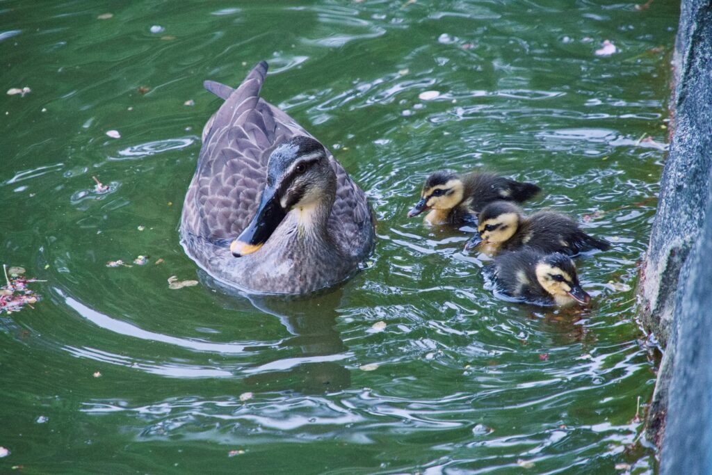 大田区池上の本門寺公園の弁天池で、カルガモの親子の泳ぐ姿が見られました。