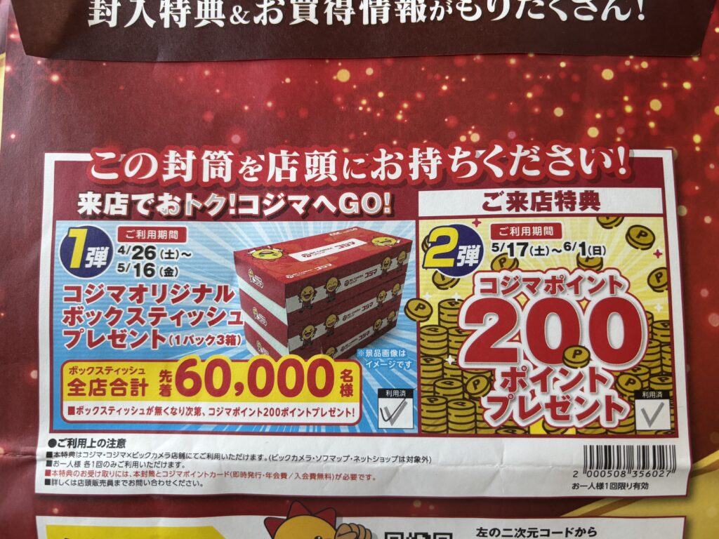 数日前に届いた「コジマ創業70周年感謝祭」の封筒を持参でお得!