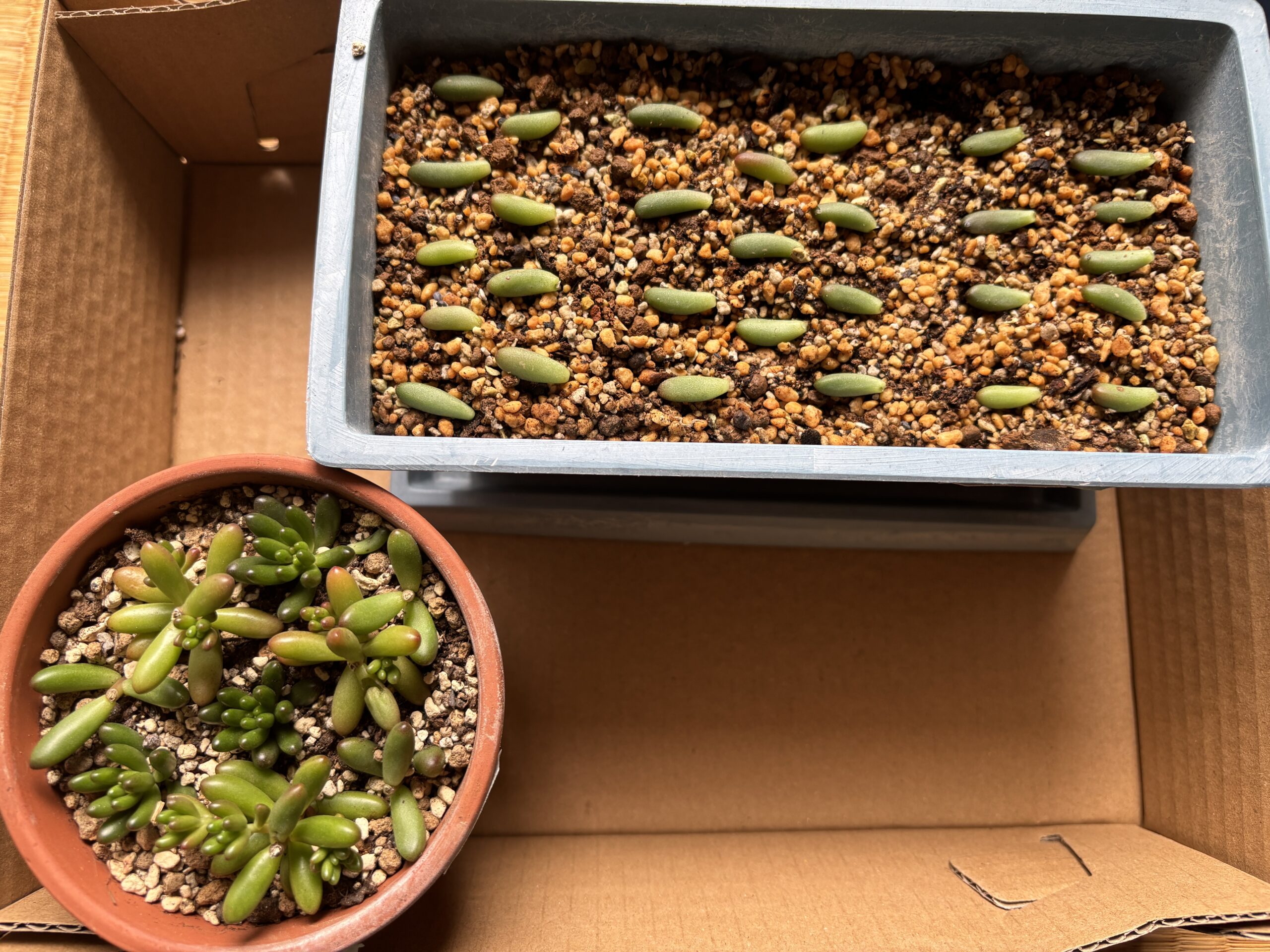 植え替えで、葉がたくさん取れたので、葉刺し(というか土に置いているだけ)を試しています。