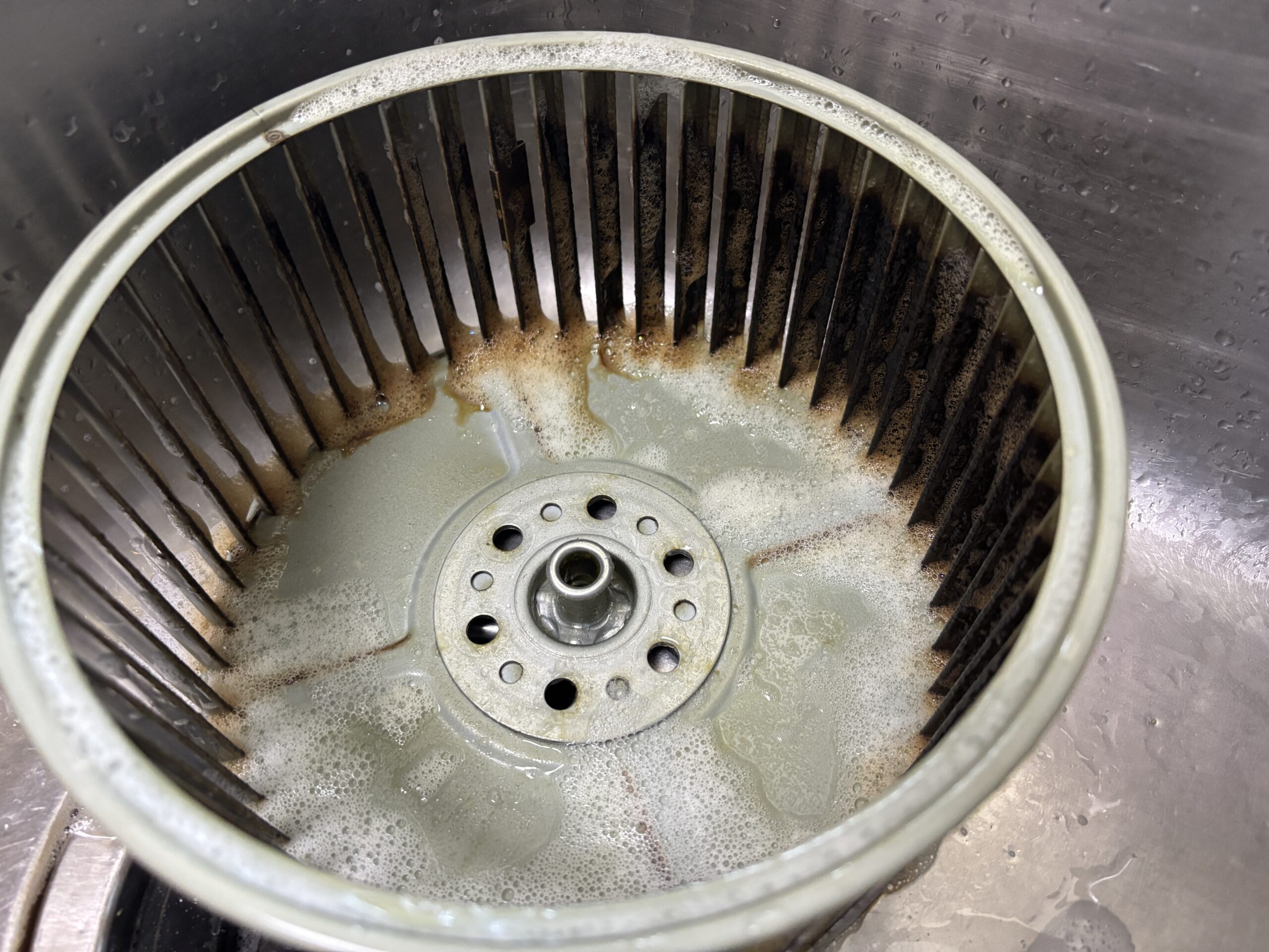 ②リンナイの換気扇用のストロングショットを100ml+60℃の熱湯の入ったバケツにつけ置き。