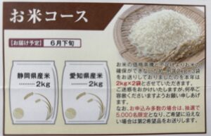 お米コースは、静岡県産米2kgと愛知県産米2kgで合計4kgとなります。