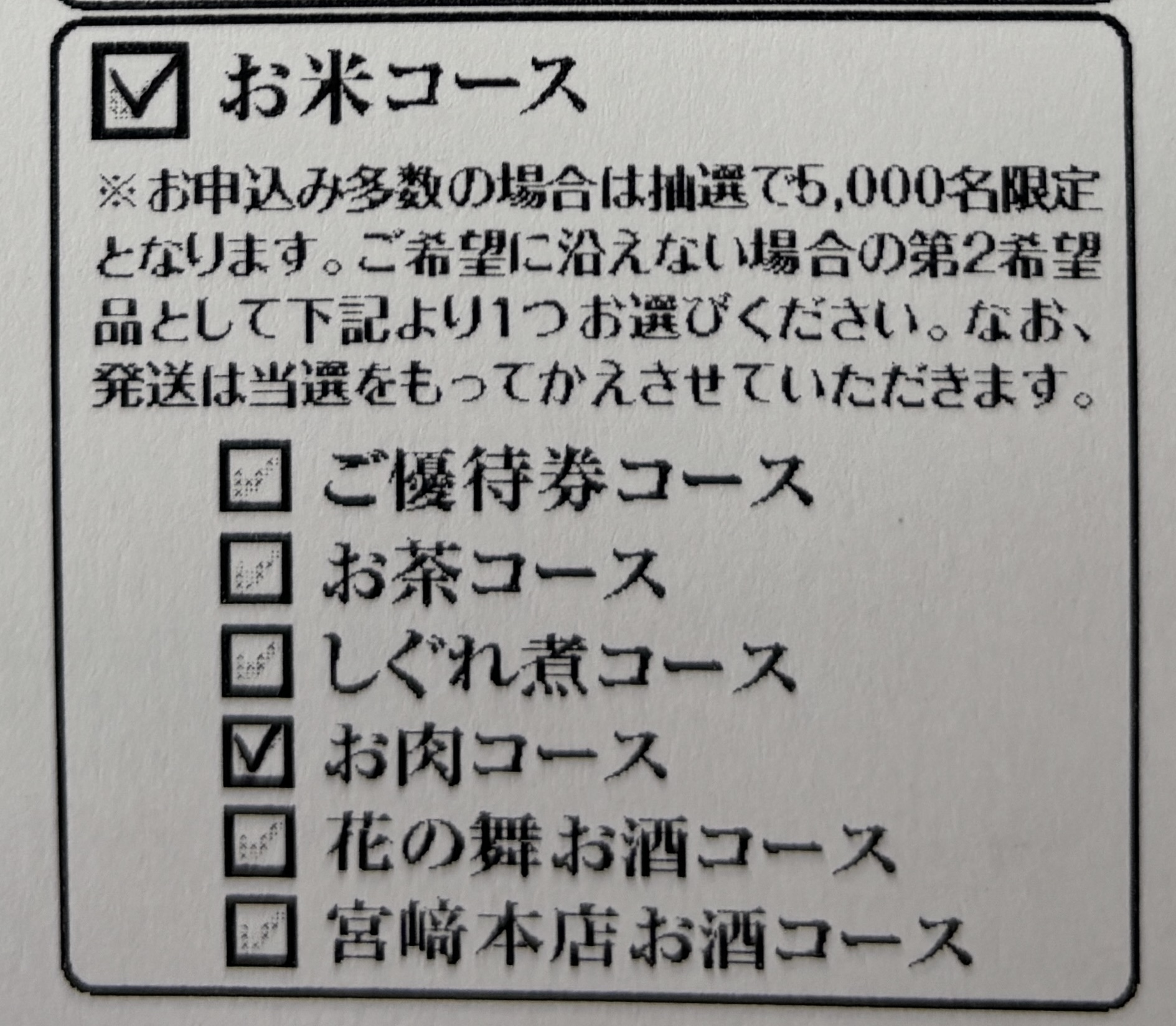 お米が欲しいのでお米コースを選び、第2希望でお肉コースにしました。
