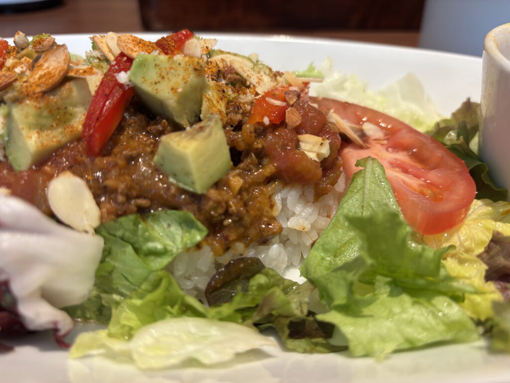 「サルサDEタコライス」到着。トッピングの種類が豊富で、アボカドもナッツもたっぷり♡