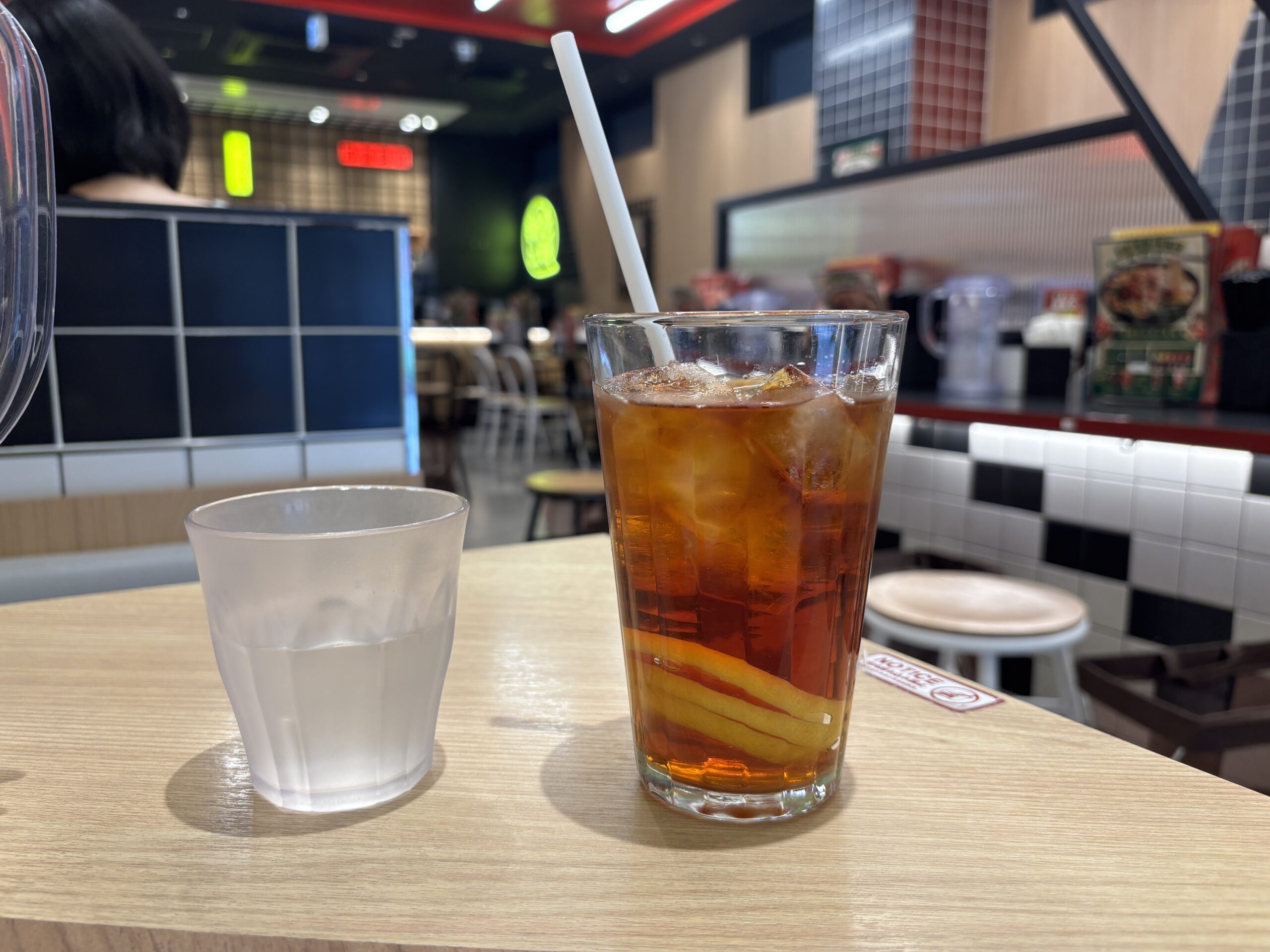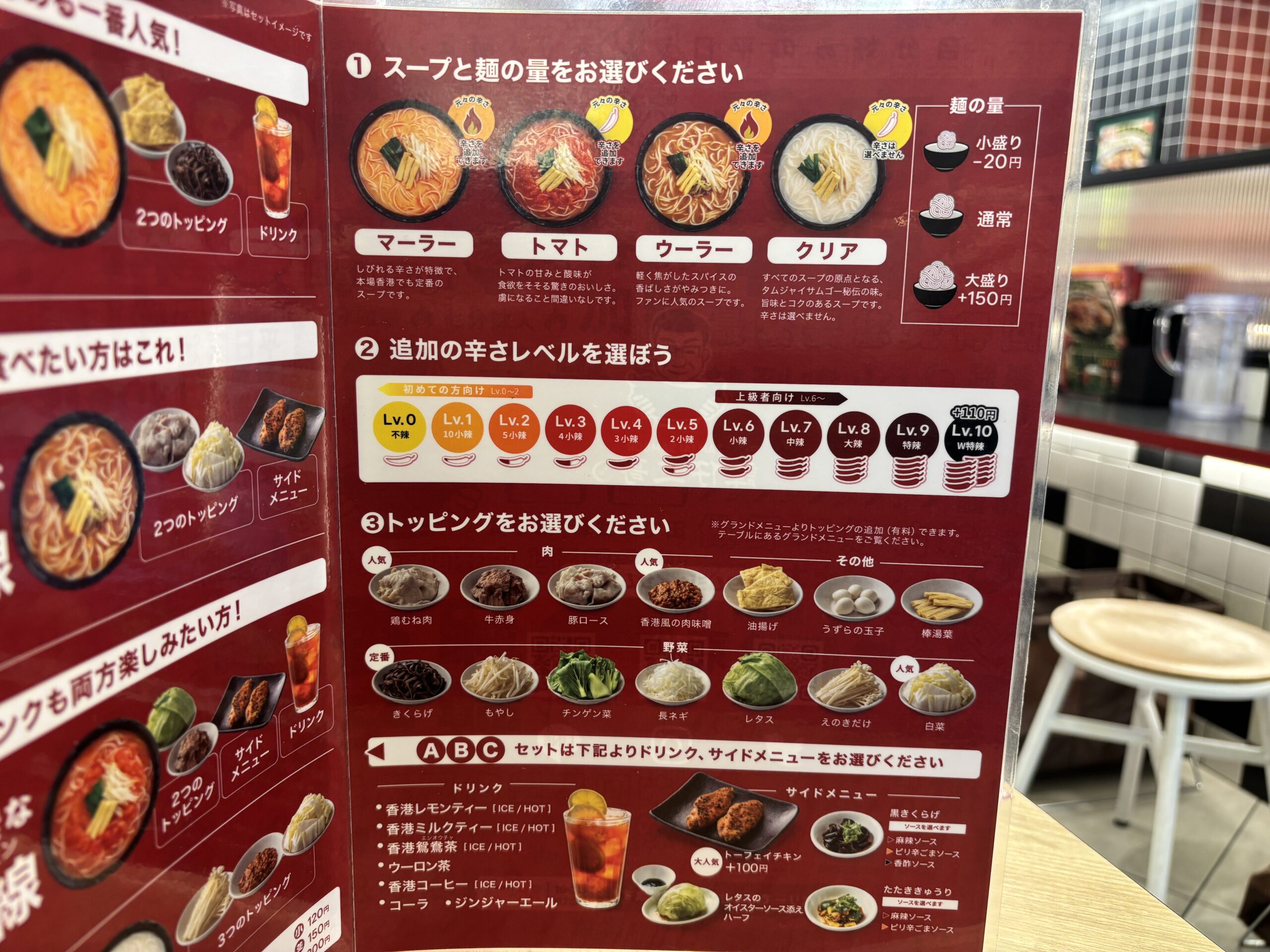 トッピングは、「鶏むね肉」と「チンゲン菜」、飲み物は「香港レモンティー」を。