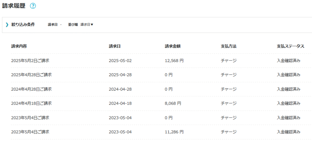 過去の請求の状況ですが、最初の11,286円は、モッピーの初回キャンペーンの都合で自腹でしたが、
