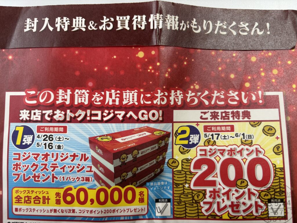 コジマ第二弾いかなくちゃ、と封筒を見なおしたばかりです