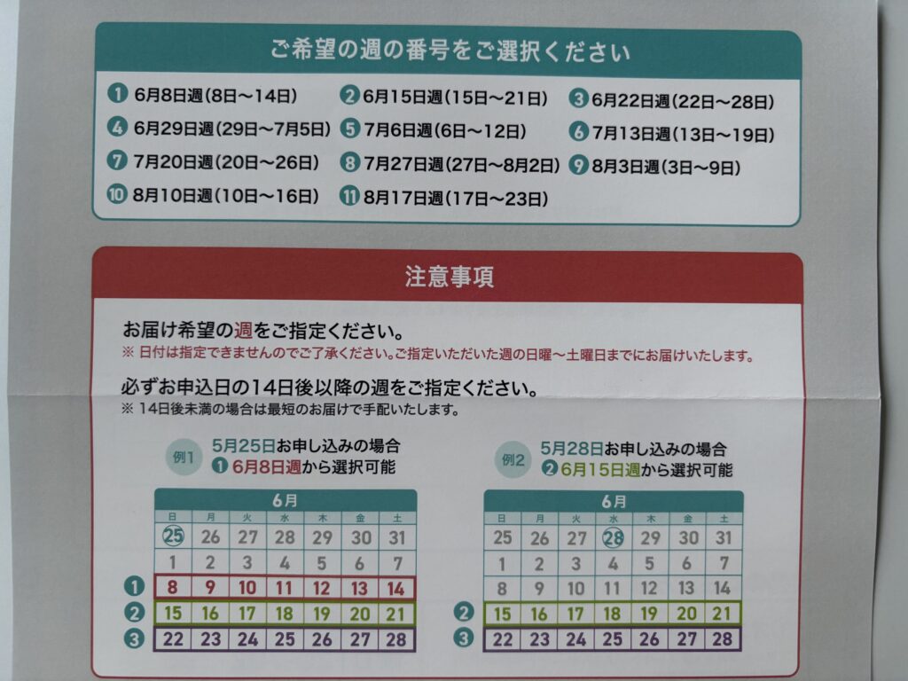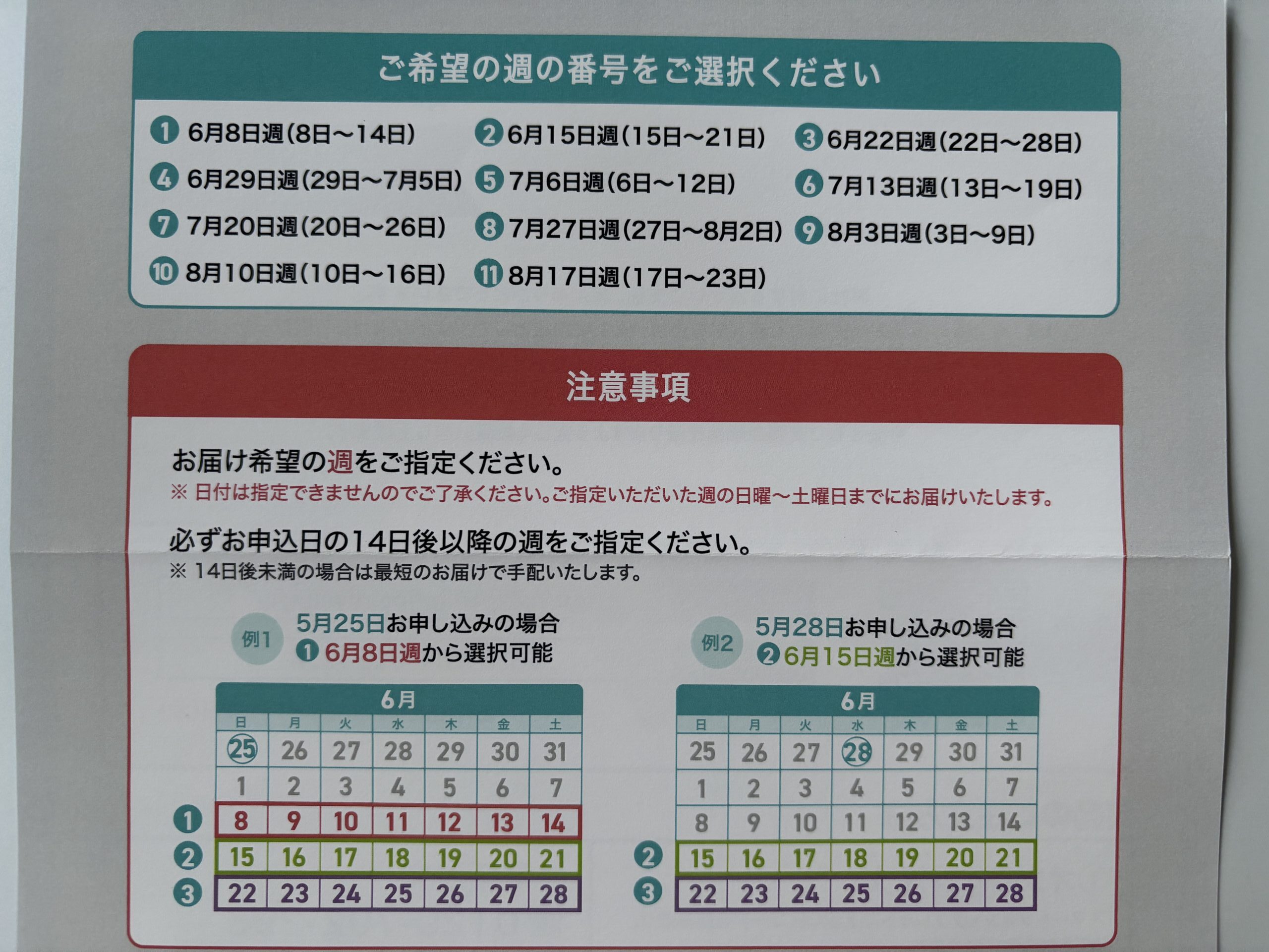 確認した所で、冷凍で届くうなぎのため、②6/15の週で申し込みました(*^-^*)