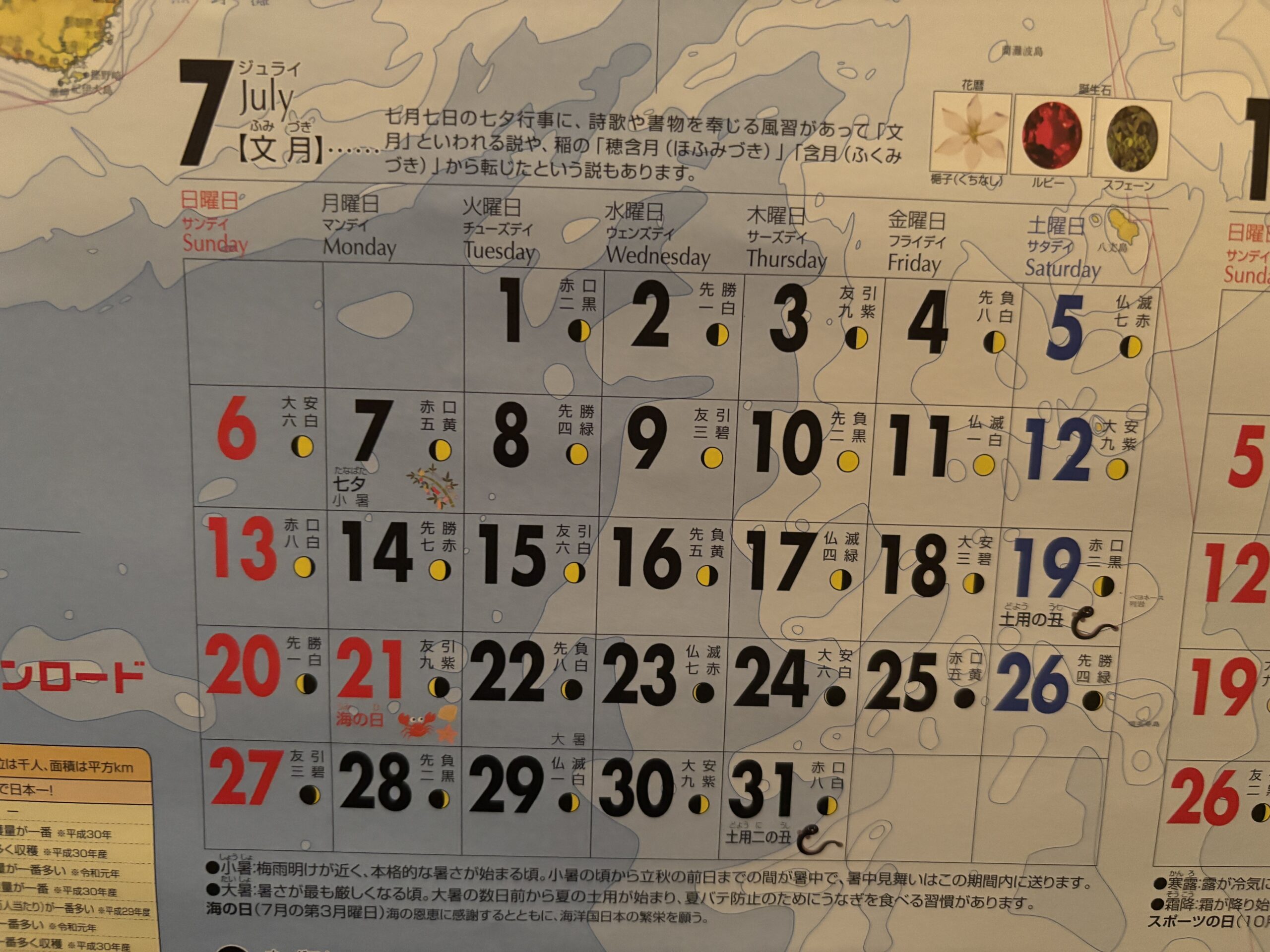 コジマのカレンダーで土用の丑の日を確認。今年は7/19(土)と7/31(木)ですね。
