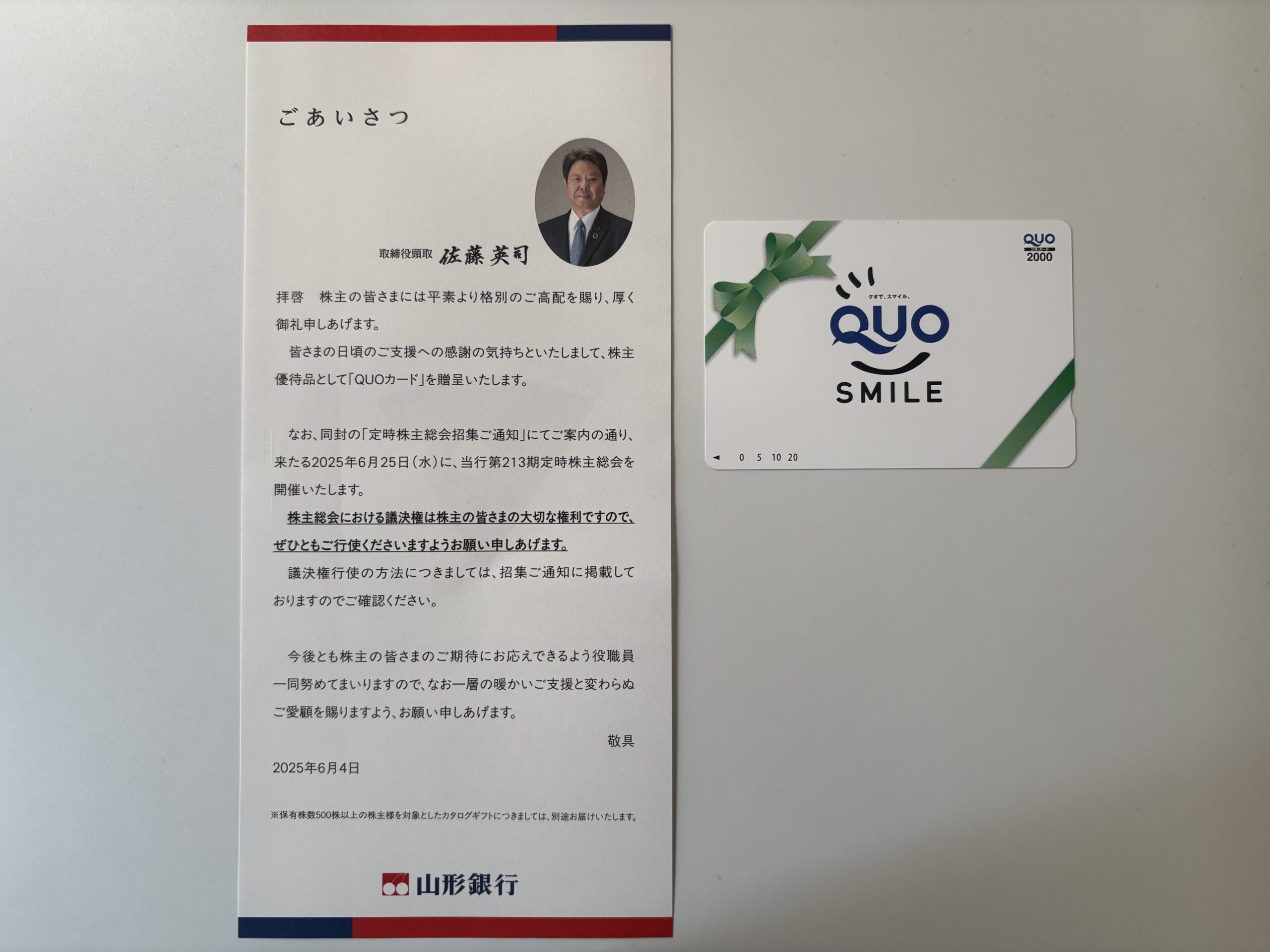 3月権利 山形銀行 (8344)の優待カタログとクオカードが届きました。