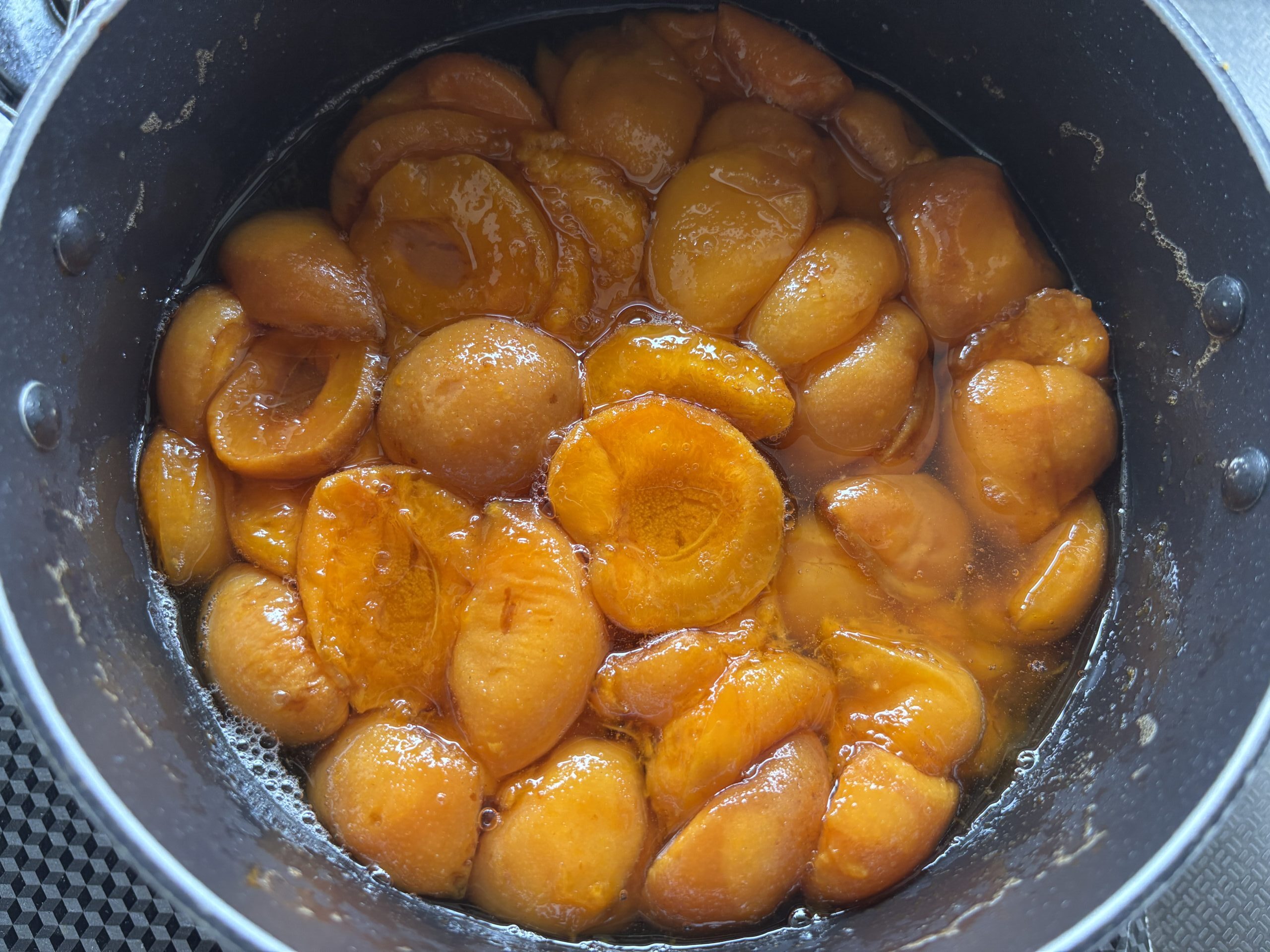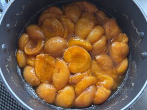 沸騰したシロップ(水とグラニュー糖)の火を止めてから、生あんずを入れて3時間。