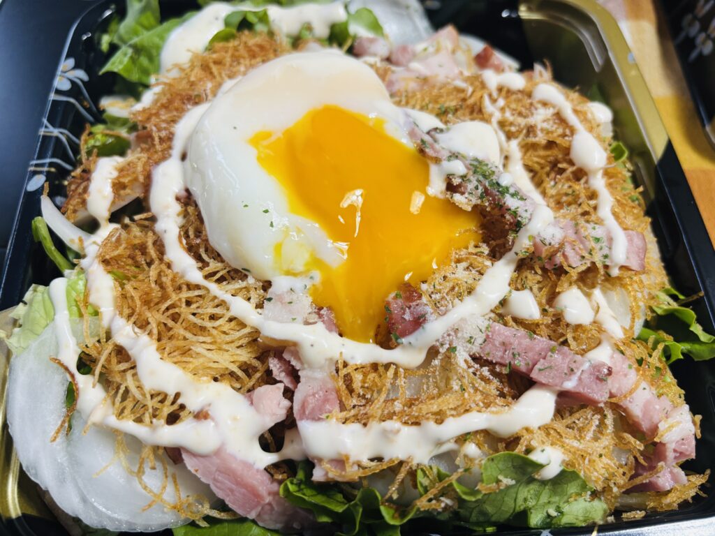 しっかり水でさらしたタマネギスライスやベーコン、何と言っても