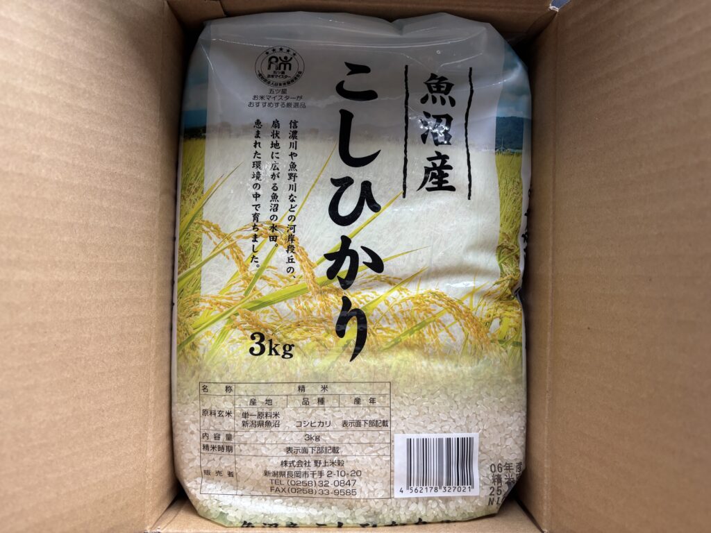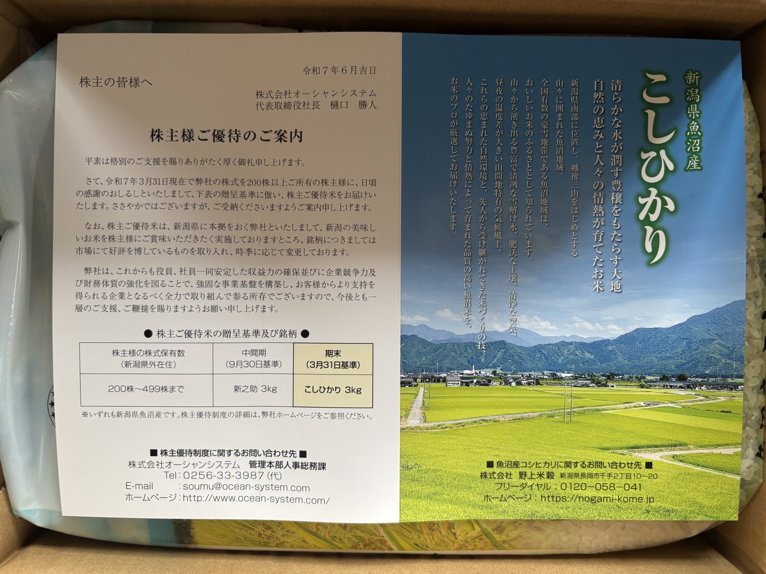 3月権利 オーシャンシステム (3096)から「新潟県魚沼産こしひかり」3kgが届きました。