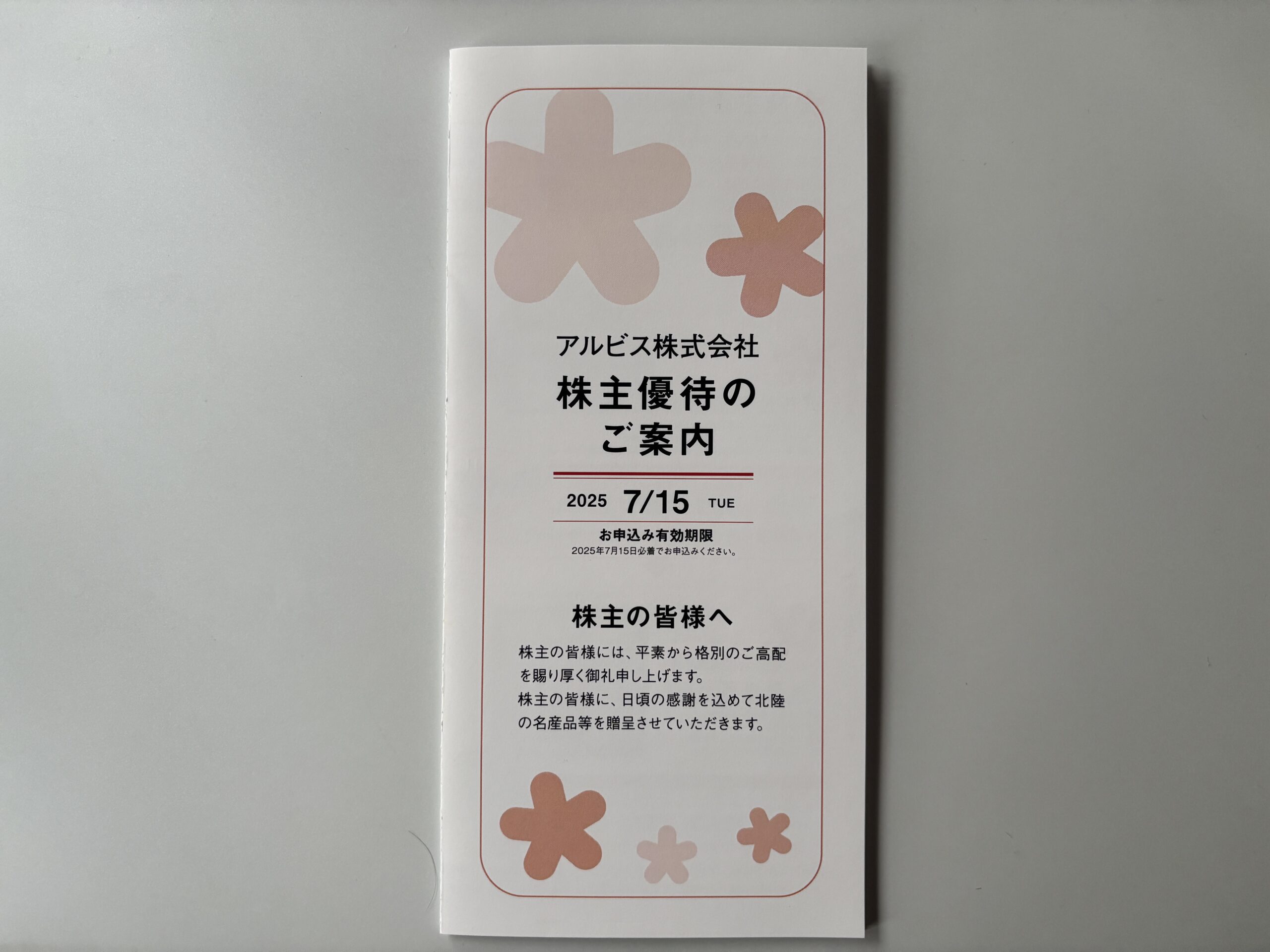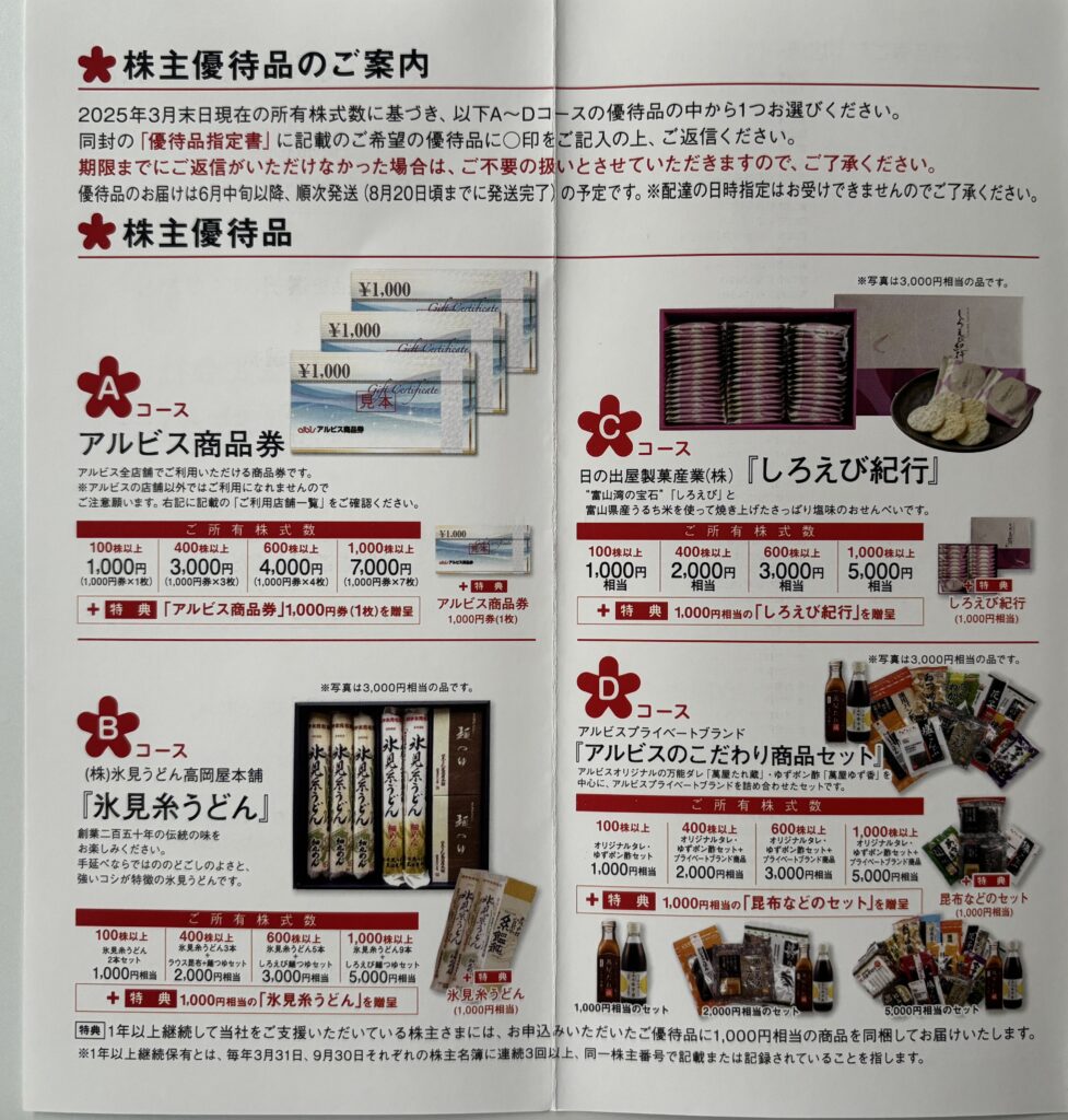 3月権利分のアルビス (7475)から優待案内が届いています(6/2着)