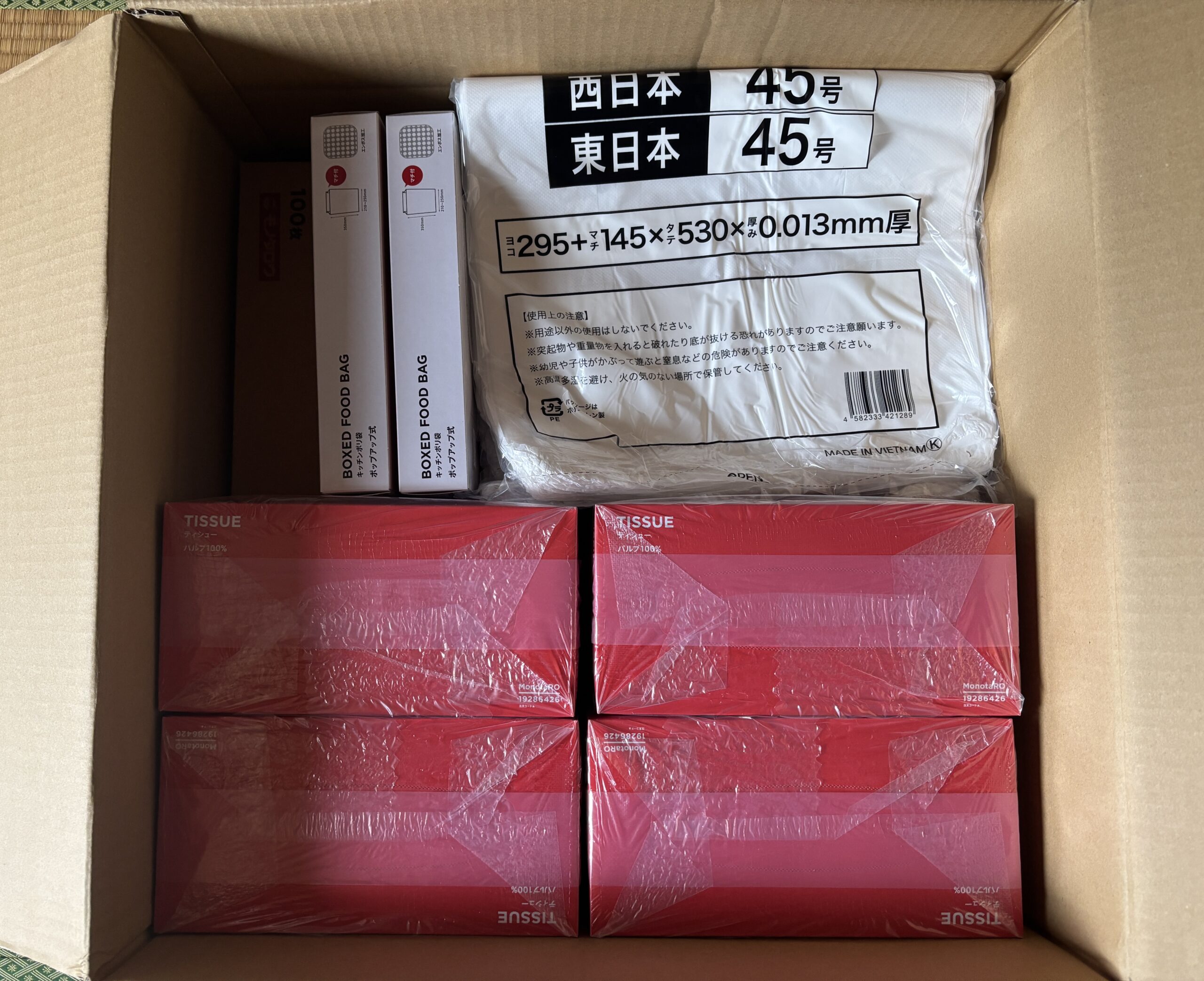 レジ袋、ティッシュ、フードバックなど大量にいただきました。