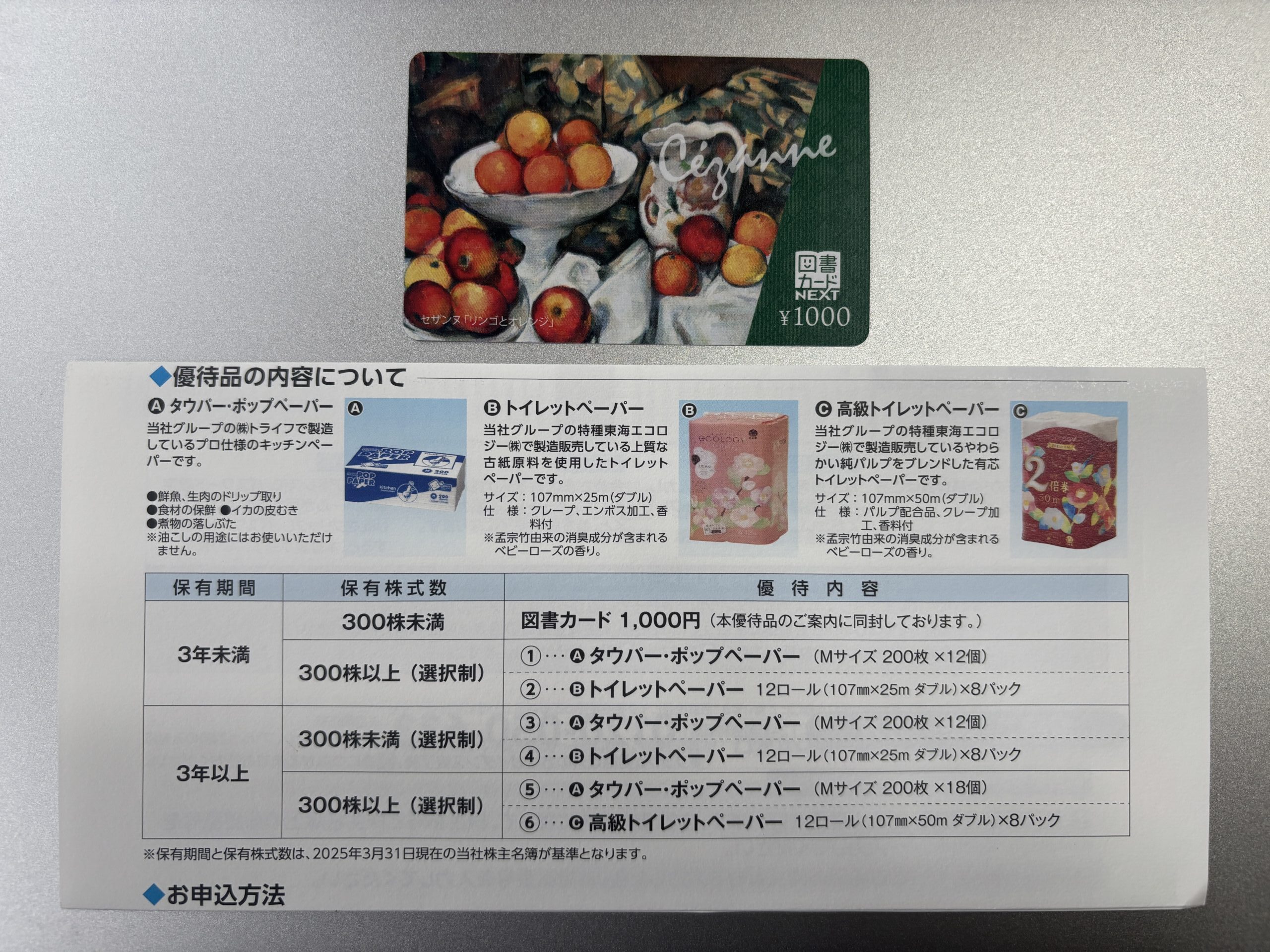 100株 1000円相当の図書カード ※3年以上 紙優待(タウパーまたはトイレットペーパー)