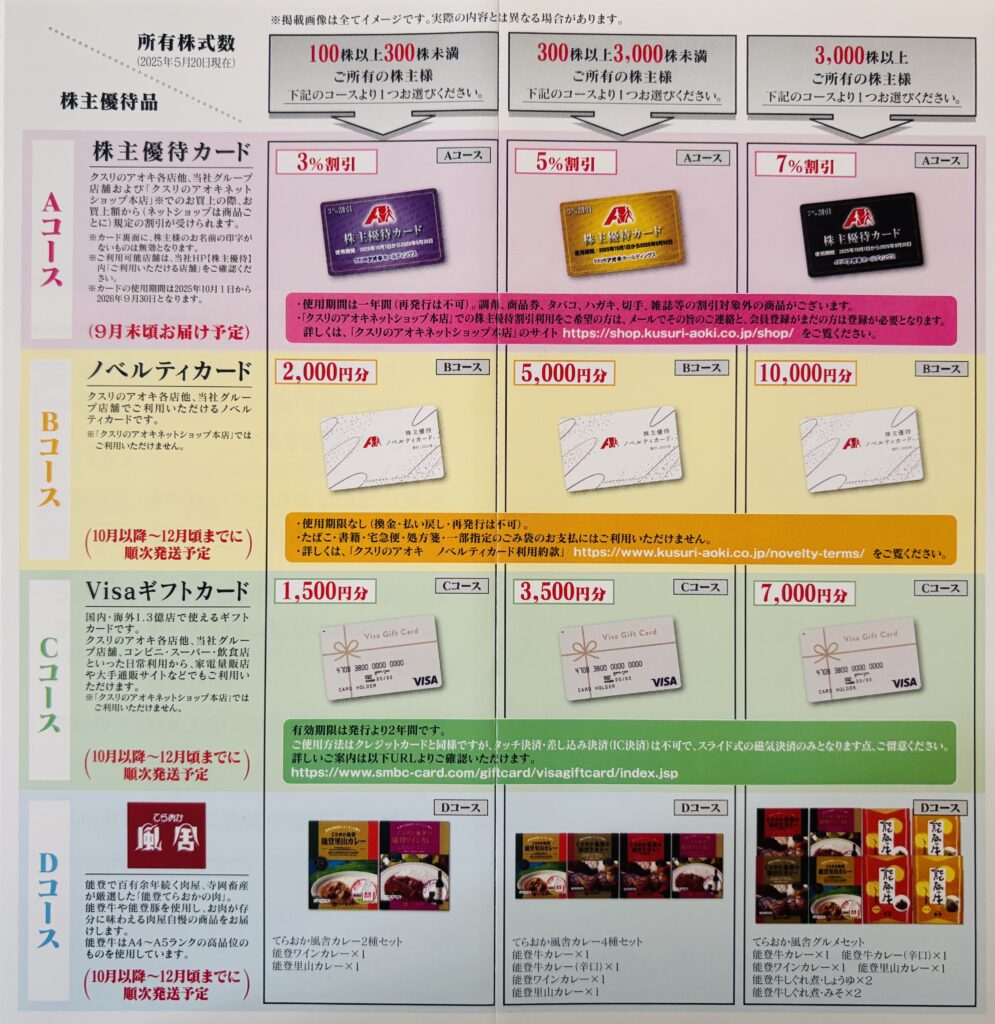 | 株数 | (A)株主優待割引カード | (B)ノベルティカード | (C)VISAギフトカード | (D)地方名産品 |