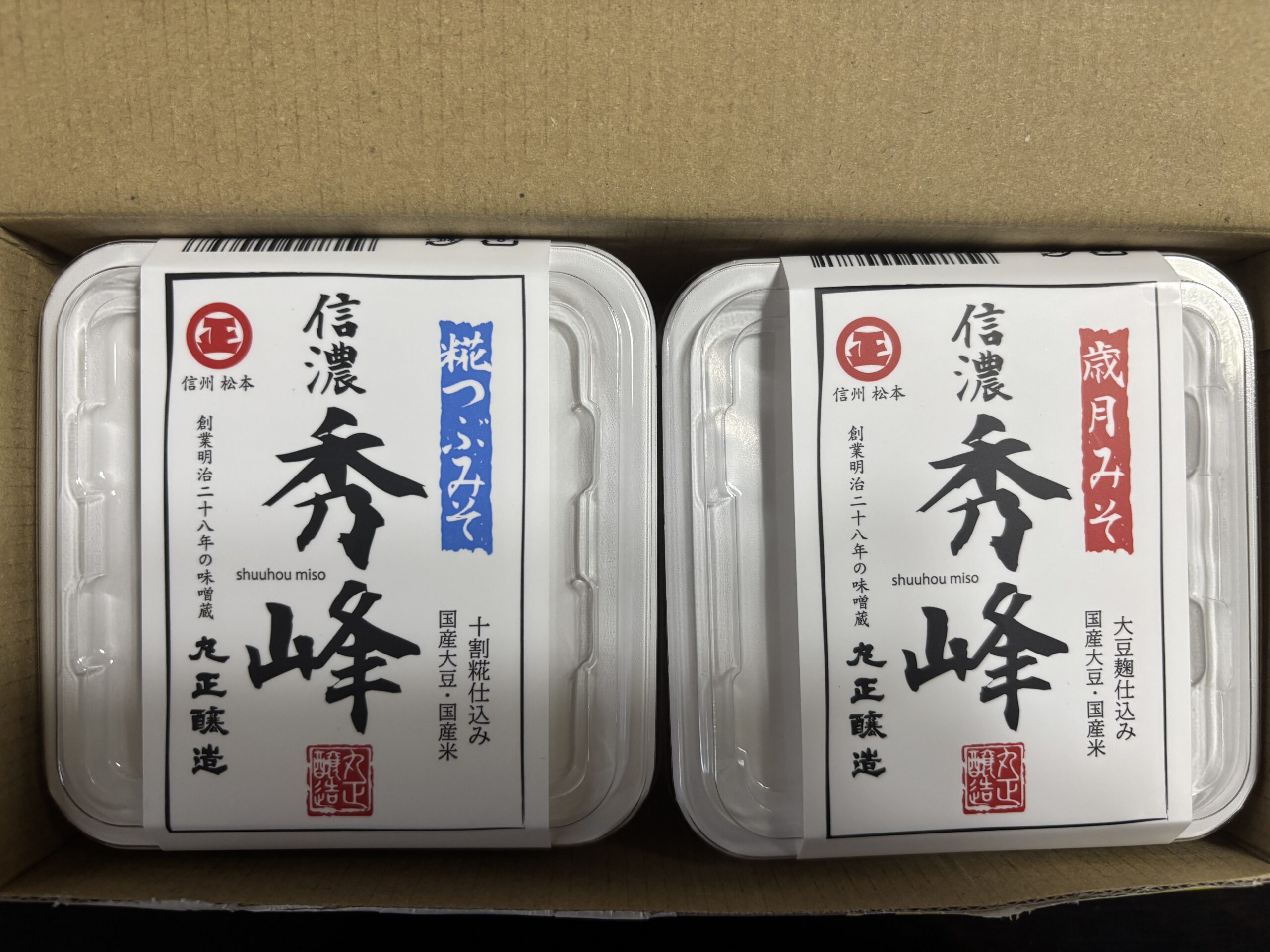 丸正醸造のみそ2種(中辛口味噌の「歳月みそ」と、まろやかさが特徴の甘口味噌「糀粒みそ」)です。
