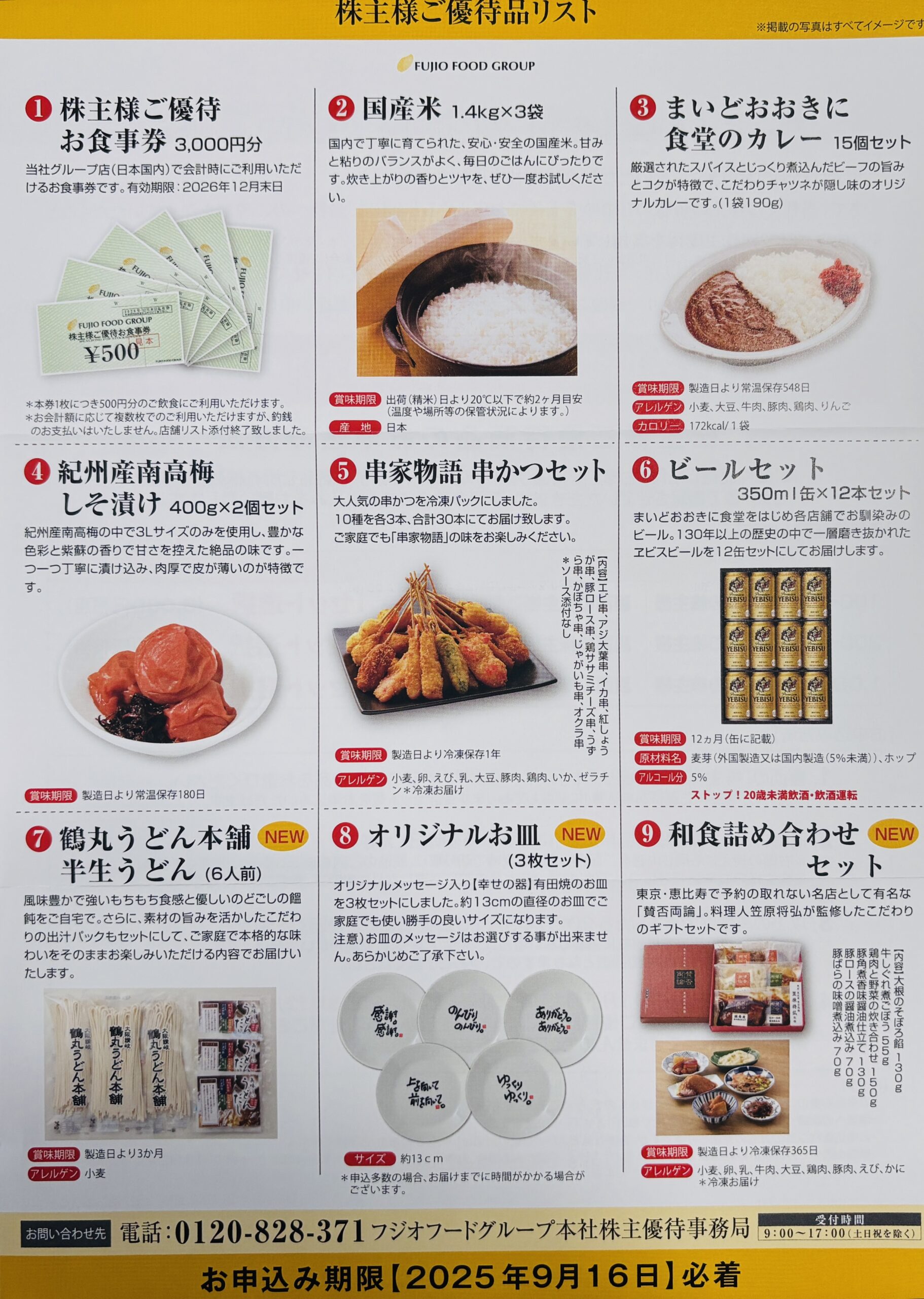 6月権利 フジオフードの優待案内が届きました(9/1到着)