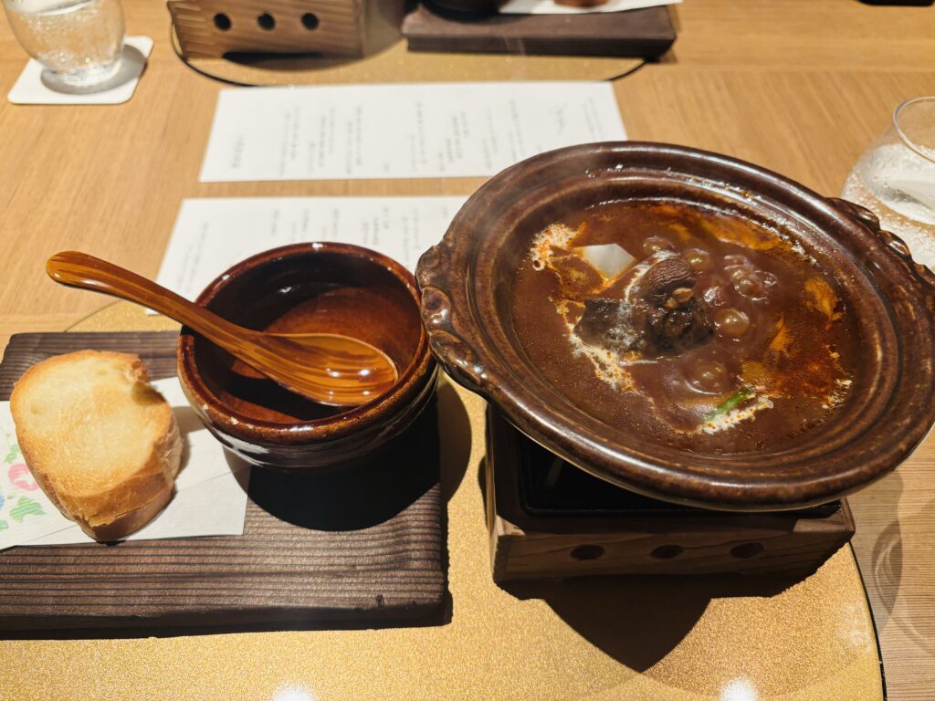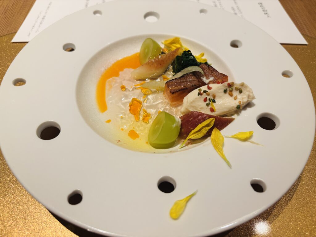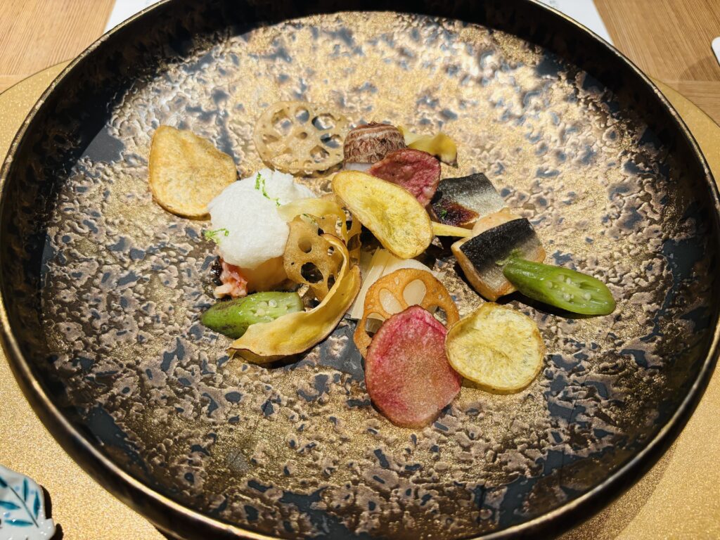 メニューを見ても漢字を読むのに必死で「??」となってしまいますが、伊勢海老の上にふわふわした蕪のムースがのっていて、小芋は皮を帽子のようにかぶっていてかわいいです。皮ごといただきました。お野菜はカリッと素揚げされています。