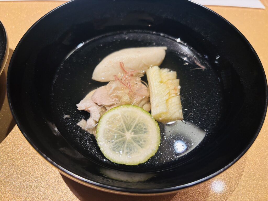 そばがき、ちたけ、栃木しゃものお椀です。濃い出汁に酢橘がよく効いています。しゃも、柔らかい♡