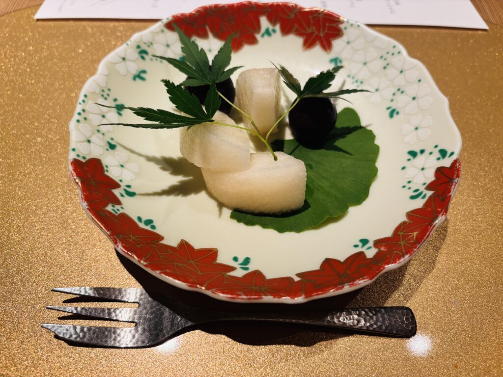 ふぉあぐらのテリーヌの上に、紅くるり(赤い大根)と京むらさき(紫の大根)が盛り付けてあり、