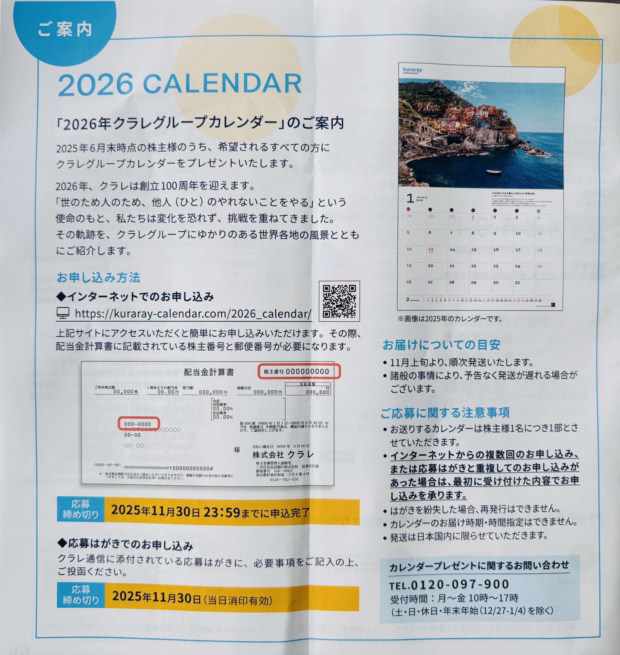先日、「2026年のクラレグループのカレンダー」のご案内が来ていました。