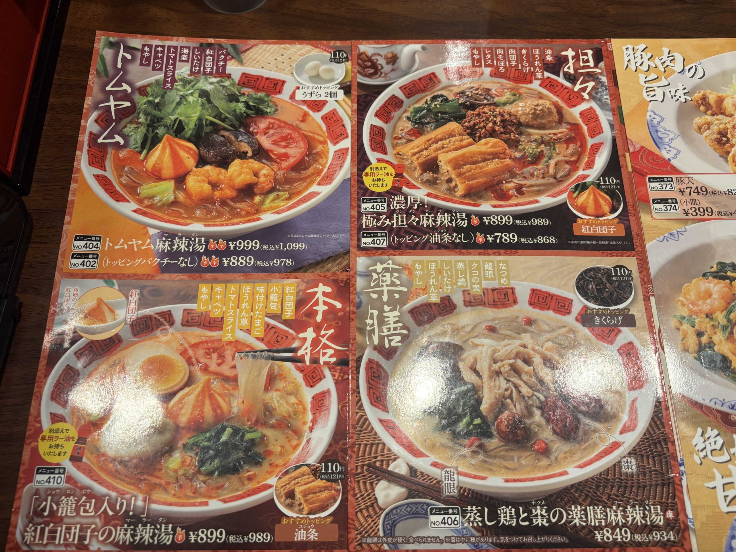 メニュー右下の「蒸し鶏と棗(ナツメ)の薬膳麻辣湯」にしました。