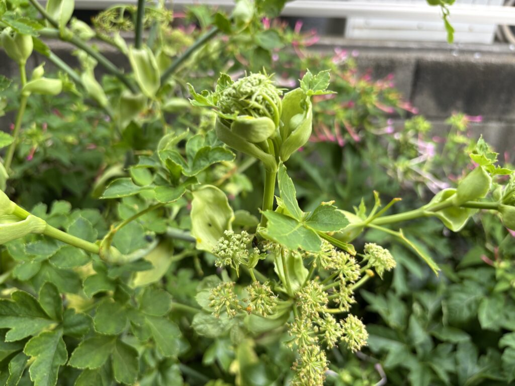 さて、実家のアシタバですが、小さな黄白色の花が咲いていました。