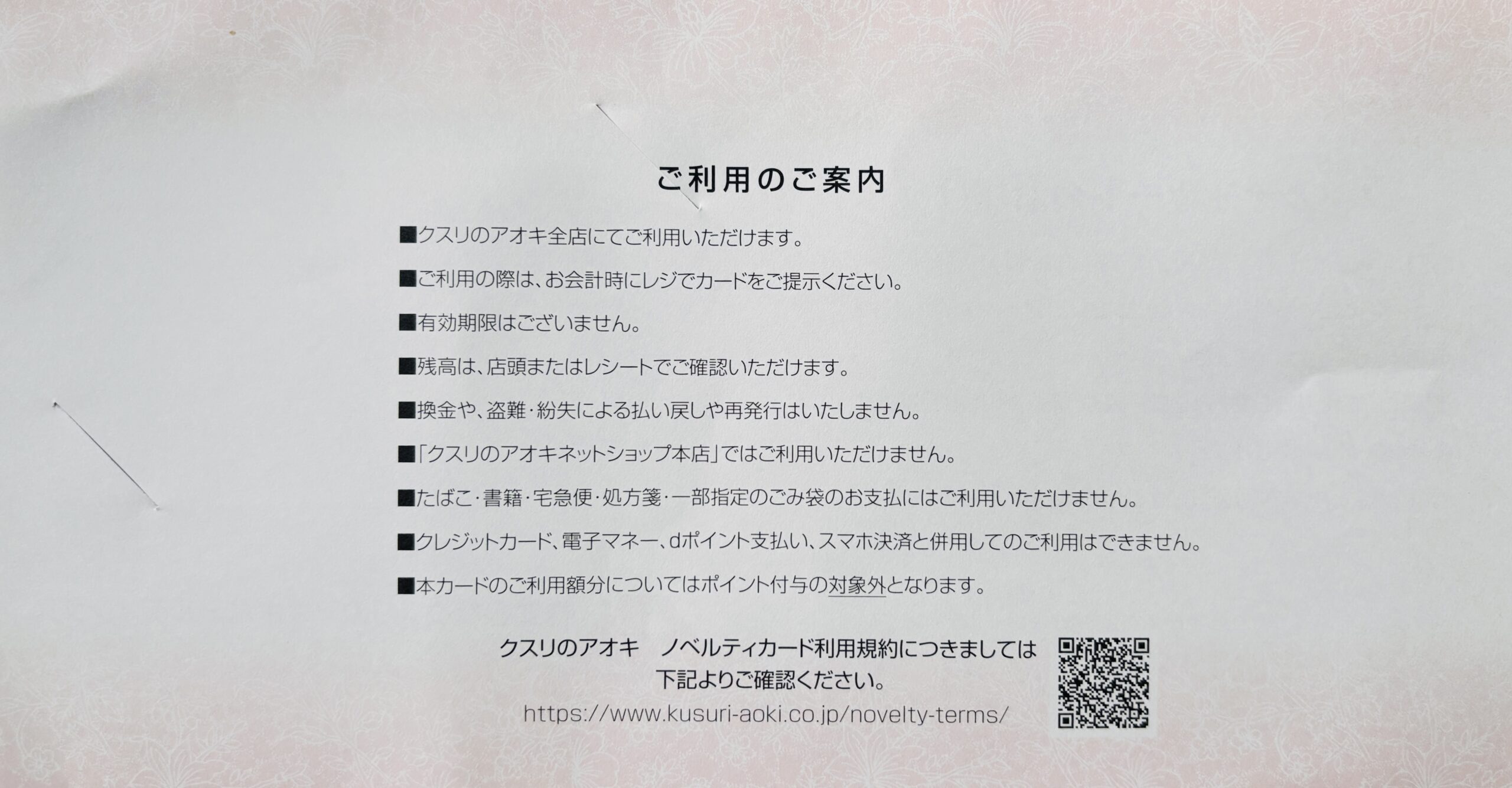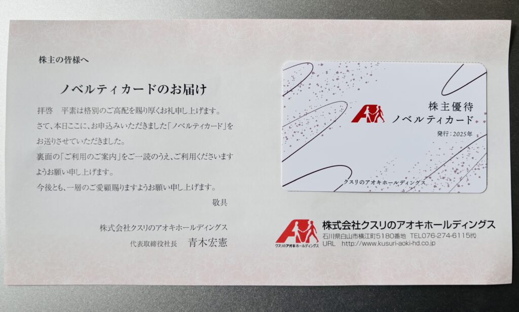 5月20日権利 クスリのアオキHD (3549)のノベルティカードが届きました(10/3到着)