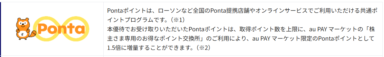 どちらの優待も、Pontaポイントを選び、auマーケット限定ポイントに交換して1.5倍の買い物で利用予定!