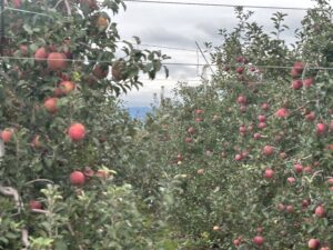 車窓から撮った写真ですが、長野では道路沿いに林檎畑が広がっていました。