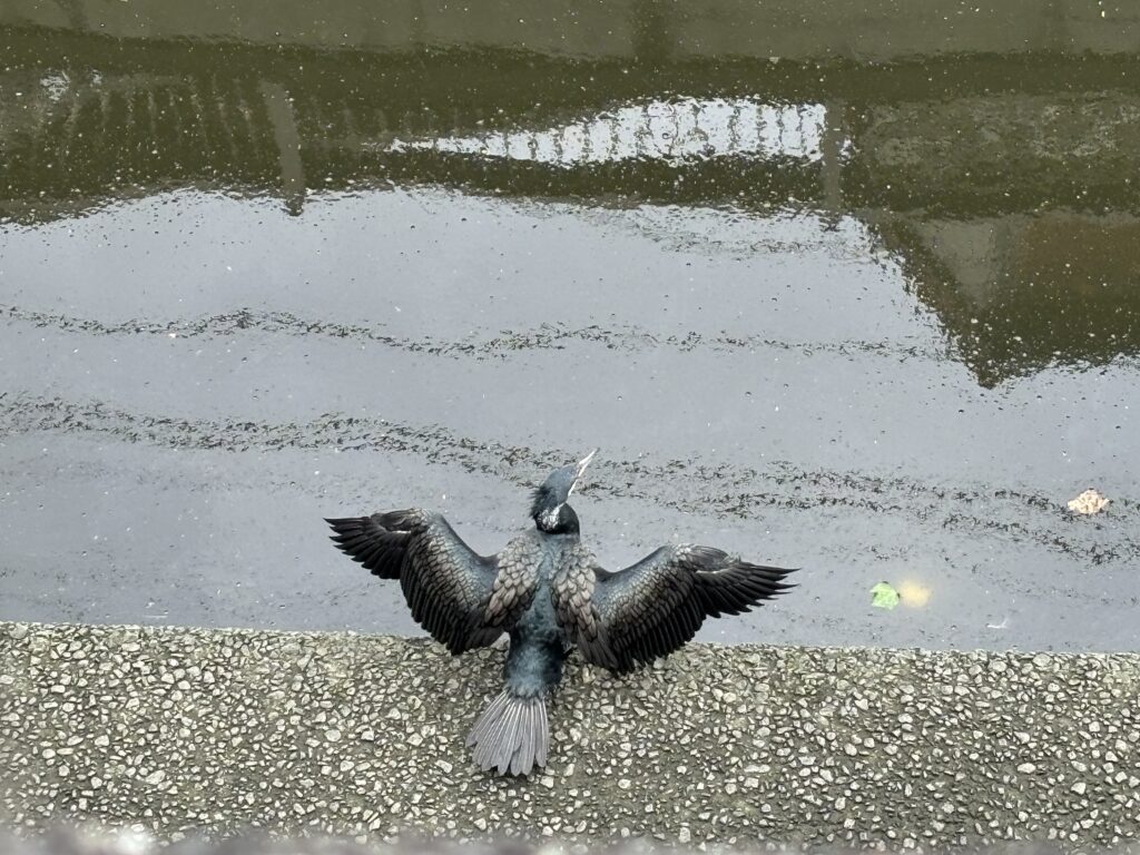 びっくりしています。カワウさん。電線の上に居るところしか見たことがなかったのですが