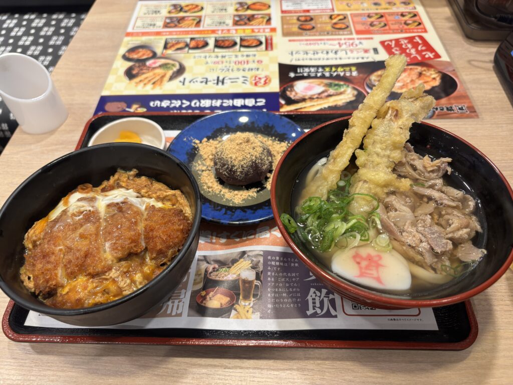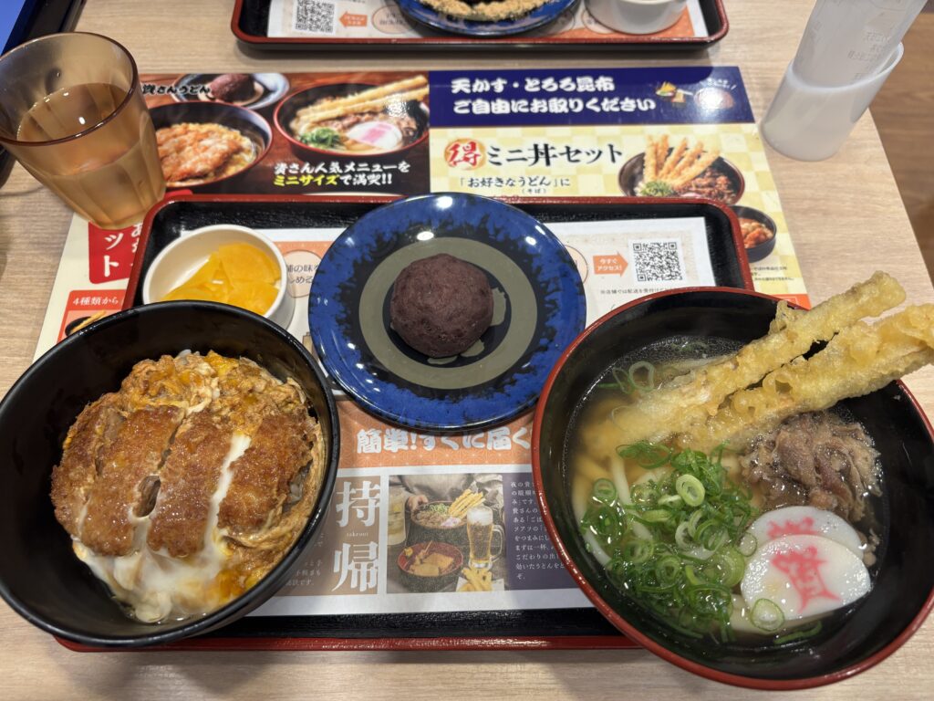 ミニ)かしわごぼう天うどん(温) + ミニ)カツとじ丼 + ミニ)きなこぼた餅