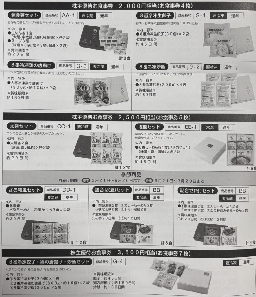 優待券を返送することで、ラーメンなどの商品と交換できます。