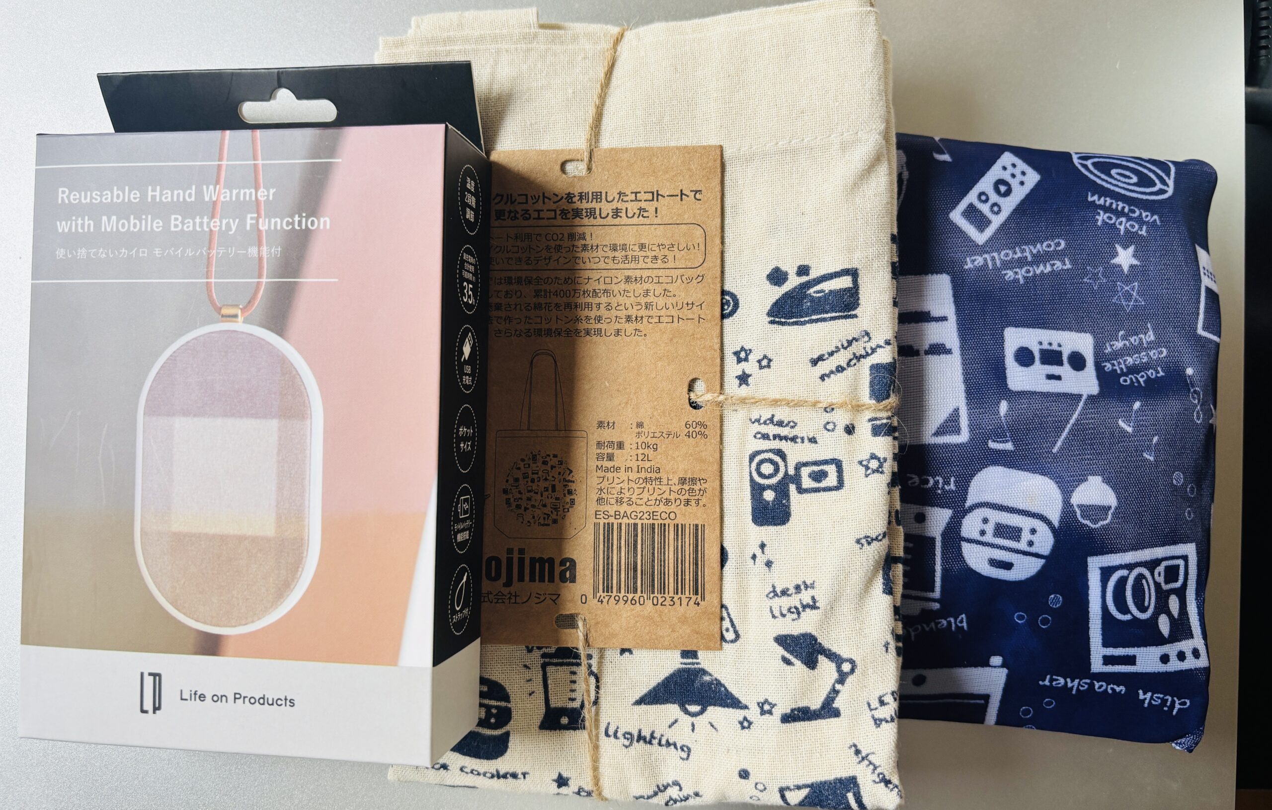 左から、購入したカイロ、紹介者がもらえるエコトート、アプリを入れてもらえるエコバッグ