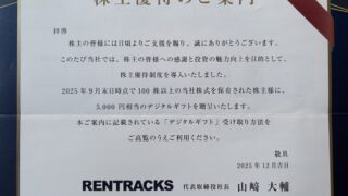 株主優待 優待到着(レントラックス)&(IPO)NSグループ (471A)上場日 こんにちは(*^^*) 小坊主です。株価情報日経平均 ▲1.56%TOPIX ▲1.78%グロース ▲2.79%優待指数 ▲0.81%(うっどさん調べ)株主優待関連IR 梅の花グループ (訂正)「新株主優待制度の導入に関するお知らせ」... 2025.12.16 株主優待