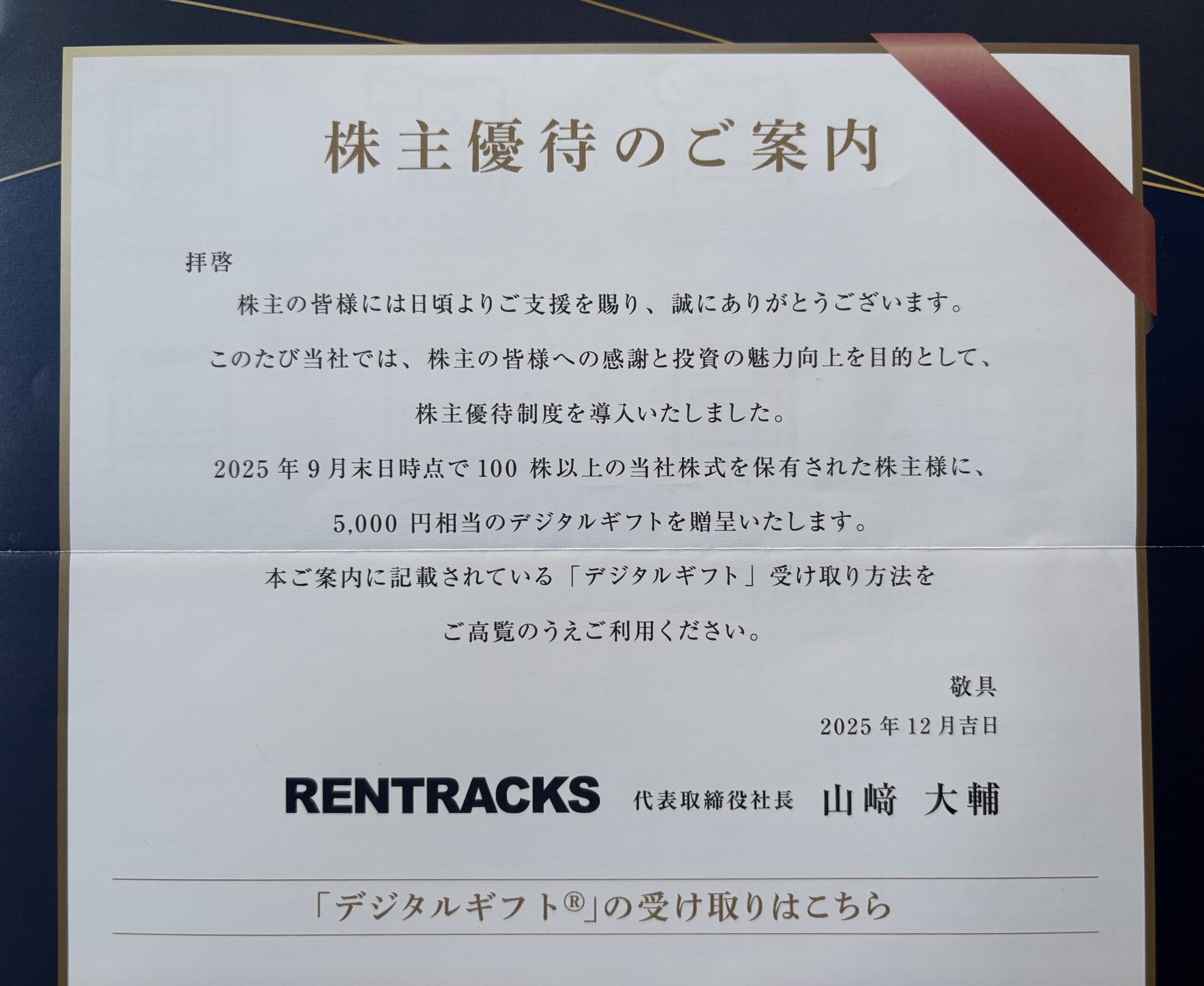 9月権利 レントラックスの優待案内が届いています(12/1到着)