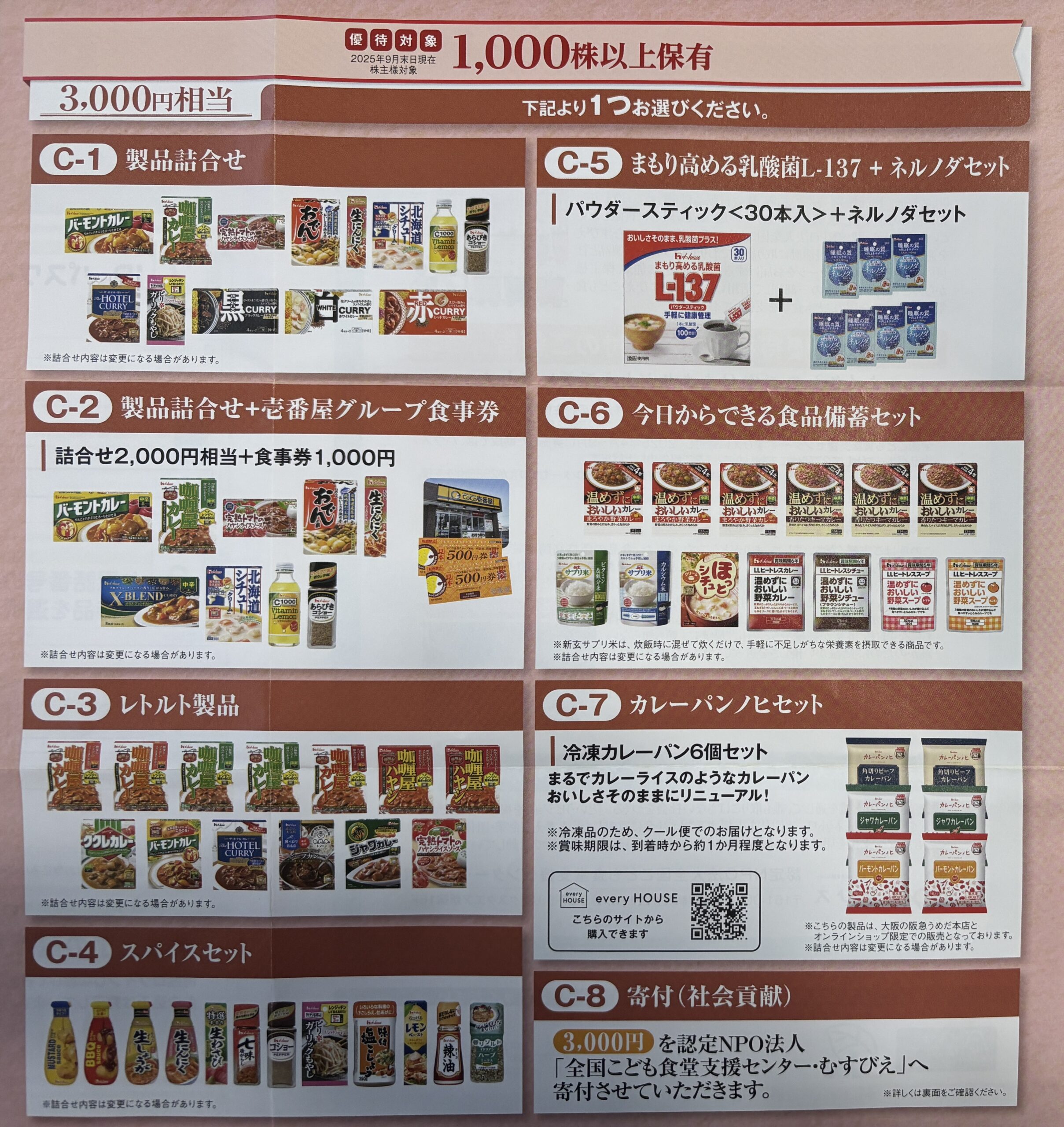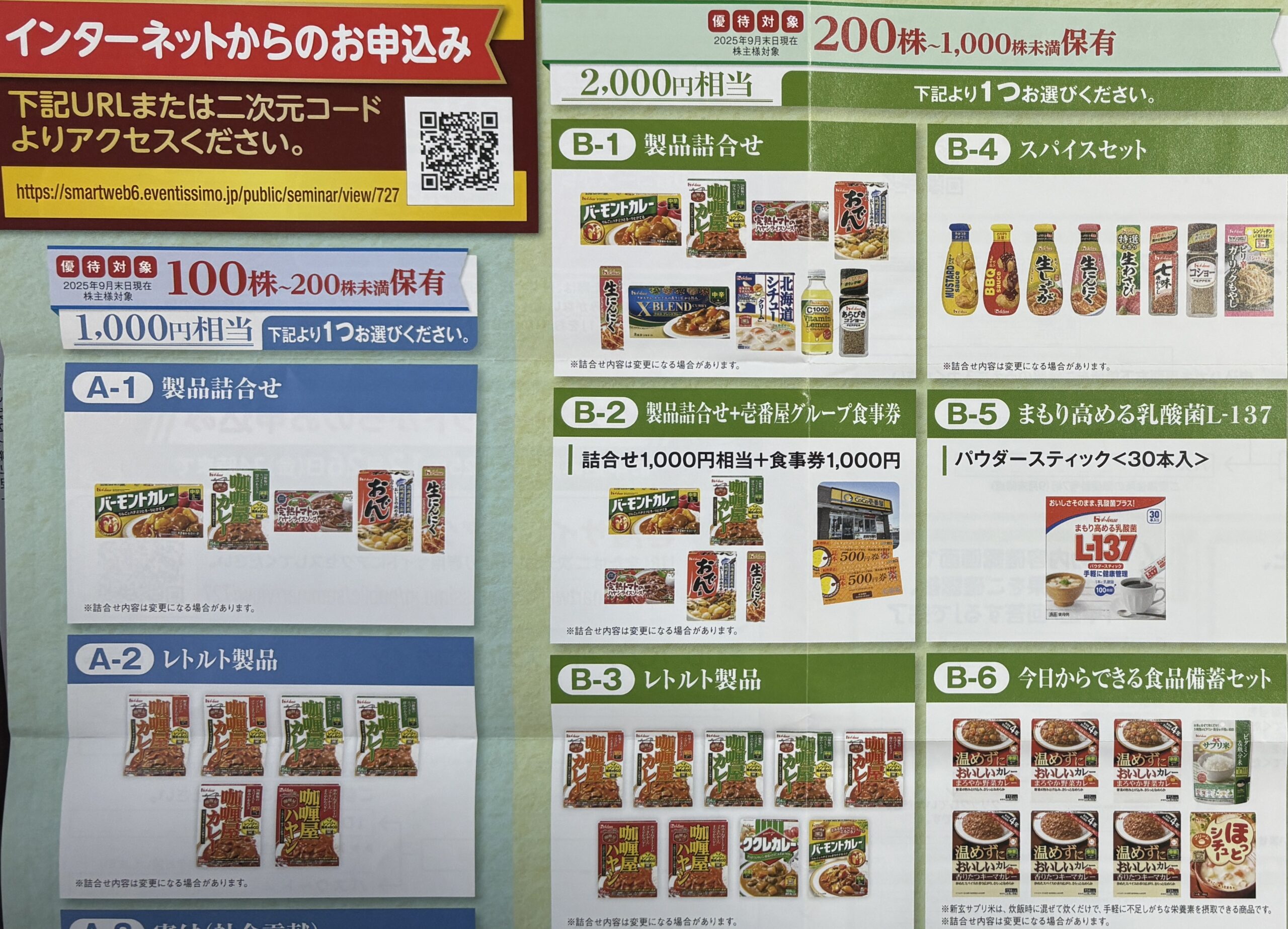 200株権利を取りましたので、B2)製品詰合せ+壱番屋グループ食事券を選びました。