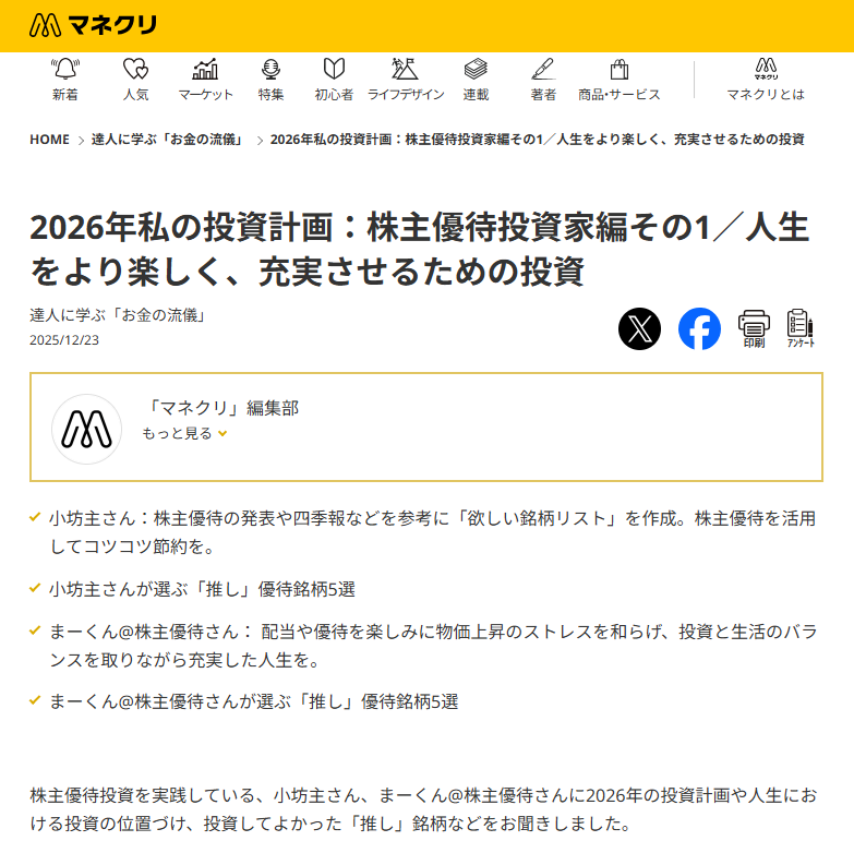 2026年私の投資計画:株主優待投資家編その1/人生をより楽しく、充実させるための投資
