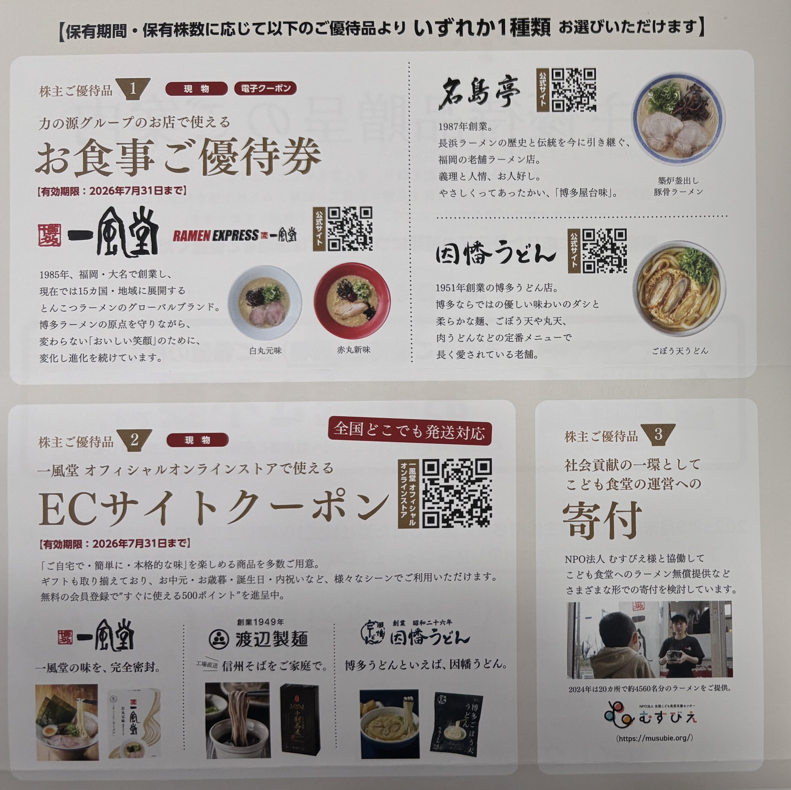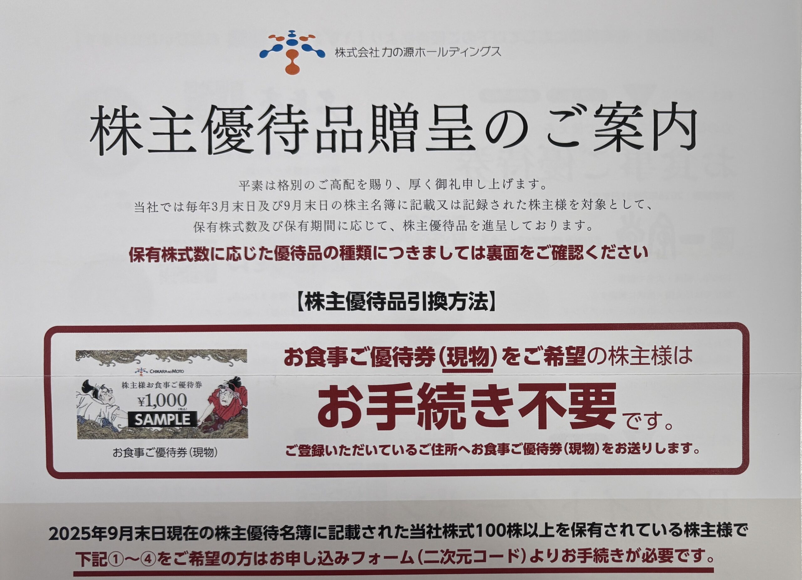 9月権利 力の源ホールディングスの優待案内が届いています(12/8到着)