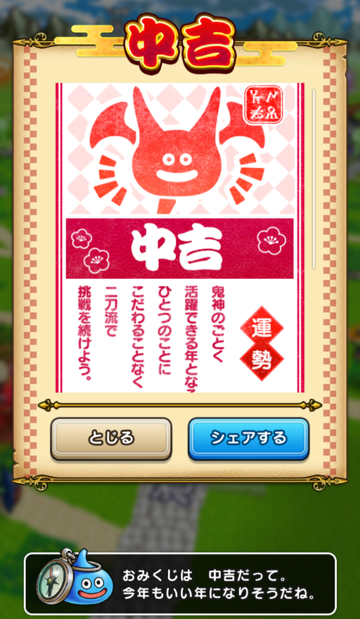 ドラクエウォークのお参りスポットで引いたおみくじは「中吉」でした!