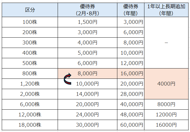 ご参考までに、クリレスの優待区分と金額の表を載せておきます。